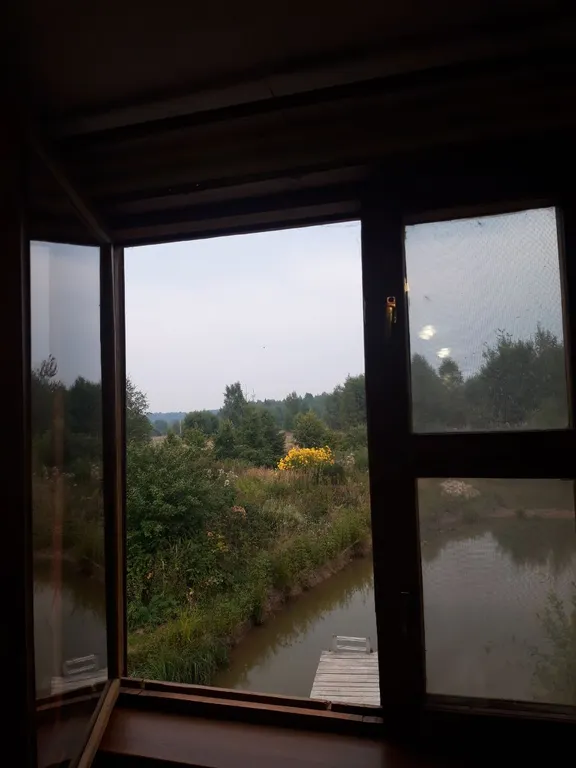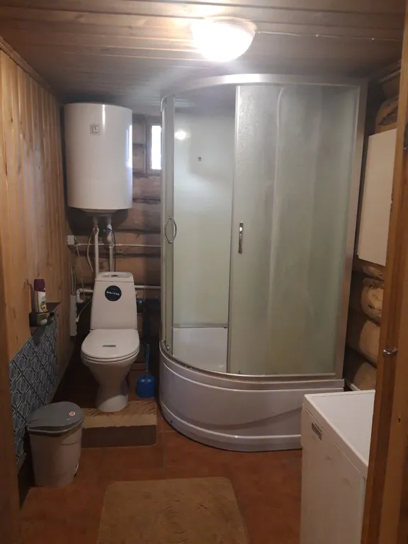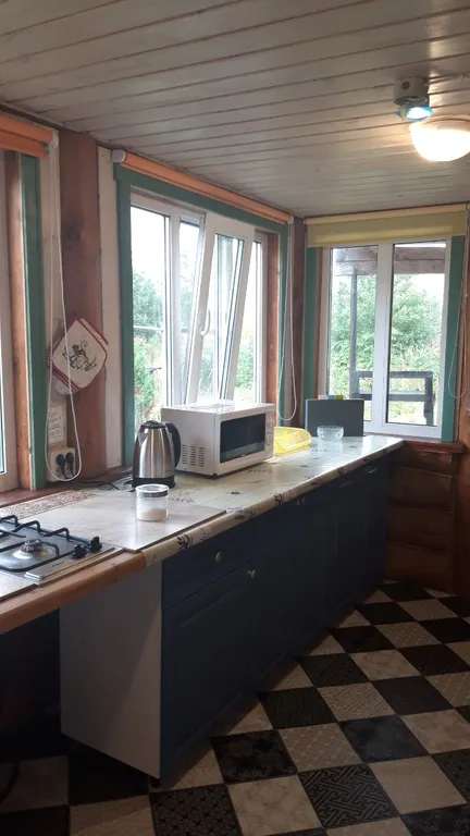 "Загородный дом-баня" с террасой и видом на озеро расположен в лесу в экопоселении Миродолье на территории усадьбы. Дом рубленный из бревна. В экологически чистом месте, рядом заповедник. Участок расположен вдали от дорог и шума, на участке есть еще дом в 20 метрах, где проживает арендодатель. Территория большая, гостям не мешаем. На территории сосновый лес, пруд, можно рыбачить. Есть мангал под крышей, беседка. Парковка. Для детей качели. На 1 этаже расположены: кухня на террасе с холодильником, электрочайником, газовой плитой на 2 конфорки, микроволновкой, есть необходимая посуда и кухонные принадлежности; спальня на 1 этаже с раскладным диваном на два места, креслом; ванная комната с санузлом и душевой кабиной, стиральной машиной, феном; отделение для парной с печью-каменкой.