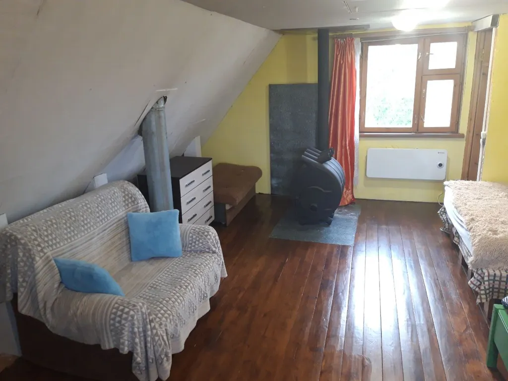Спальная комната на 2 этаже, 35 м.² расположены: телевизор (30 каналов+Smart TV), 2спальная кровать, две односпальные кровати, одноместный диван и раскладное кресло-диван. Помещения оборудованы обогревателями, комфортную температуру можно выставить самостоятельно. В доме холодная/горячая вода из крана.