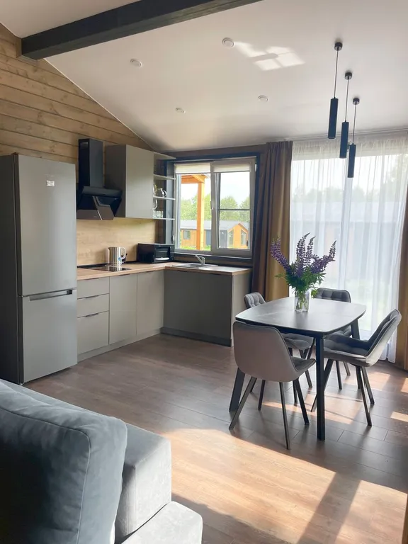 Просторная кухня-гостиная, идеально подходящая для семейных встреч и дружеских посиделок. Большой раскладной диван. Обеденный стол и стулья на 6 гостей.