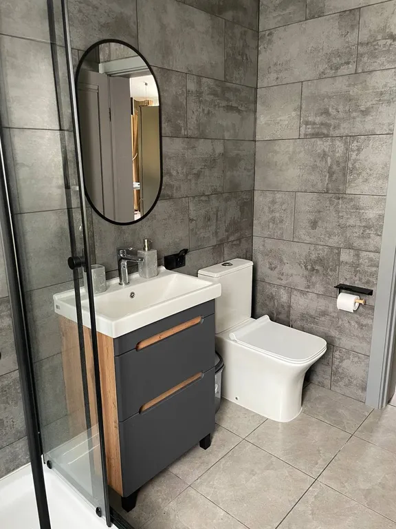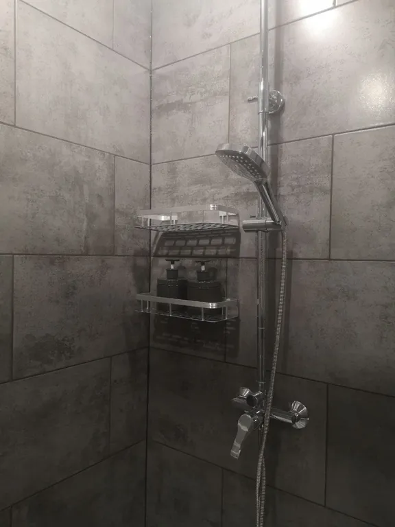 Современный санузел – душевая кабина с тропическим душем, теплые полы.