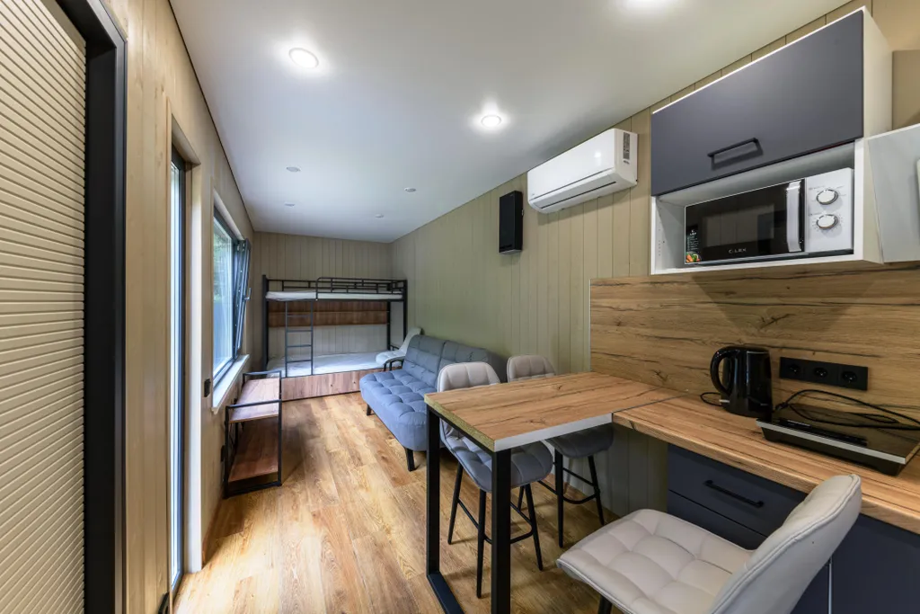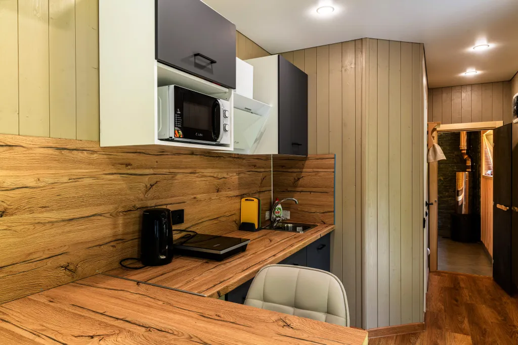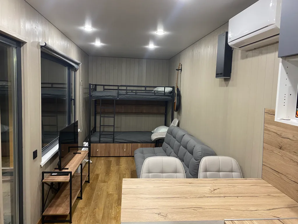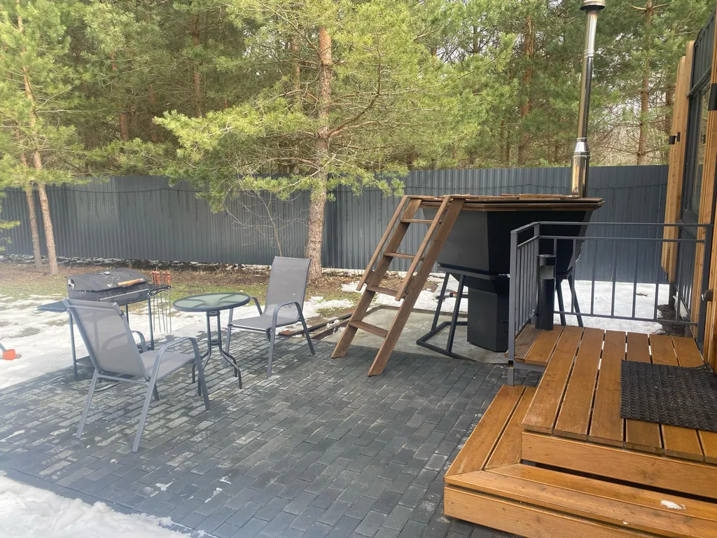 -Дом рыбака. Предназначен для комфортного размещения трех (максимум 4) взрослых гостей или семейной пары с детьми. Оборудован санузлом с душем и русской баней на дровах (входит в стоимость проживания продолжительностью не более 4-х часов). В доме есть полноценная кухня с барным столом, двухъярусная кровать и раскладной диван. Имеется вся необходимая посуда, бытовая техника и спальные принадлежности. Рядом с домом есть банный чан на дровах (оплачивается отдельно, топится самостоятельно).