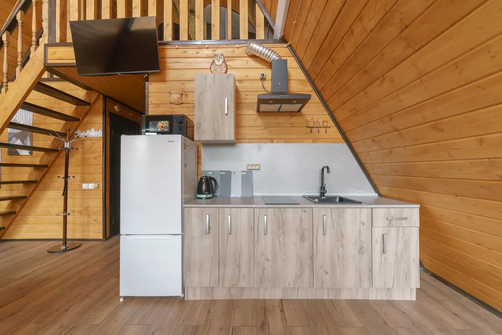 Имеется: холодильник, микроволновая печь, электроплита, СМА.