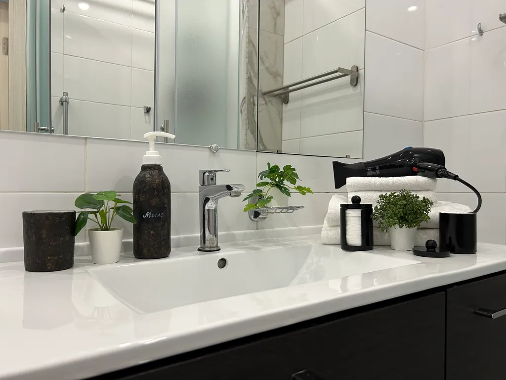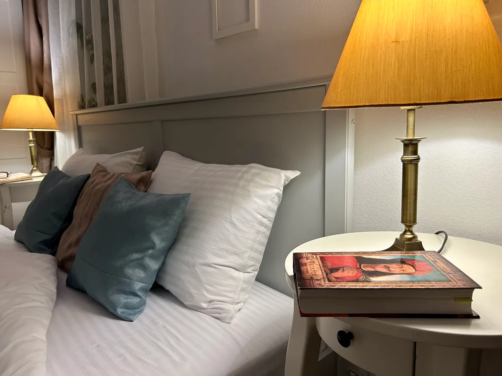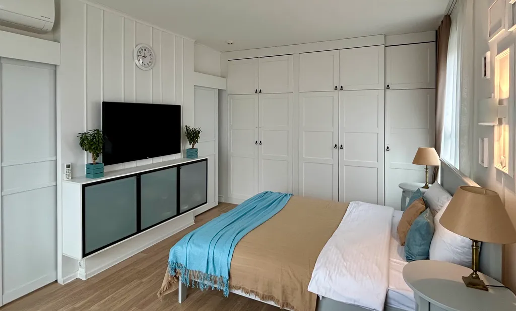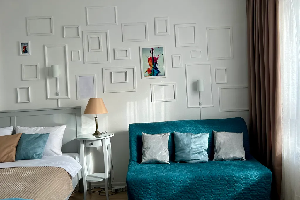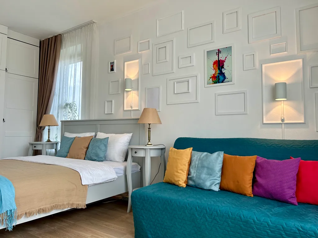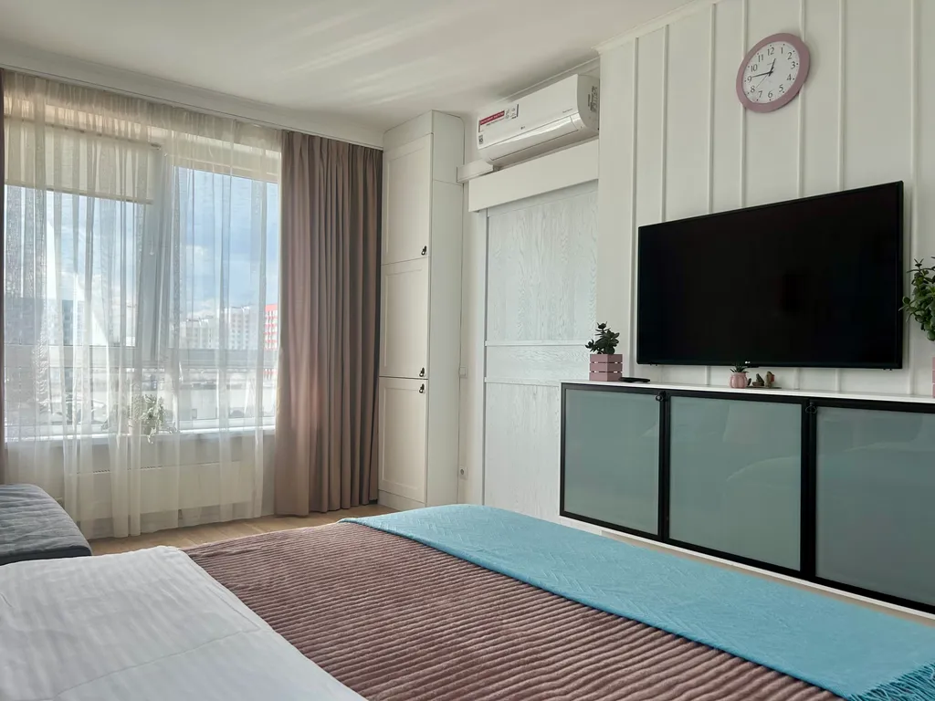 Удобная кровать с ортопедическим матрасом + раскладной диван для 2-х гостей. Качественное сатиновое хлопковое бельё, мягкие полотенца, шторы + рулонки.