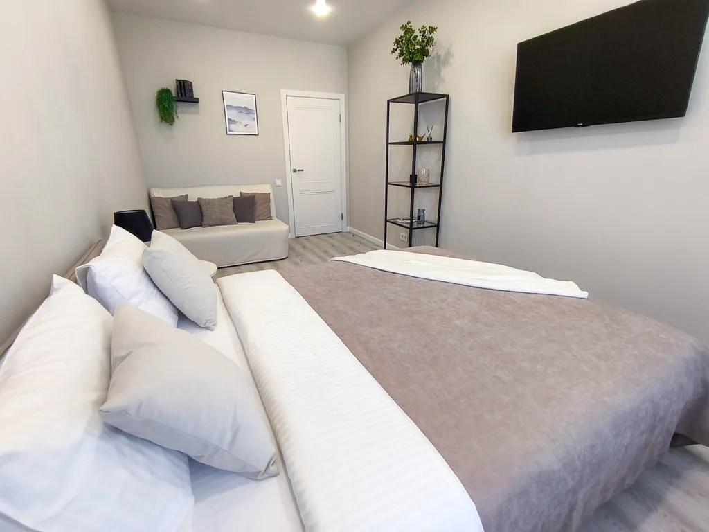 Мебель: большая двуспальная кровать с ортопедическим матрасом + дополнительное место раскладывающийся диван, оплачивается отдельно.