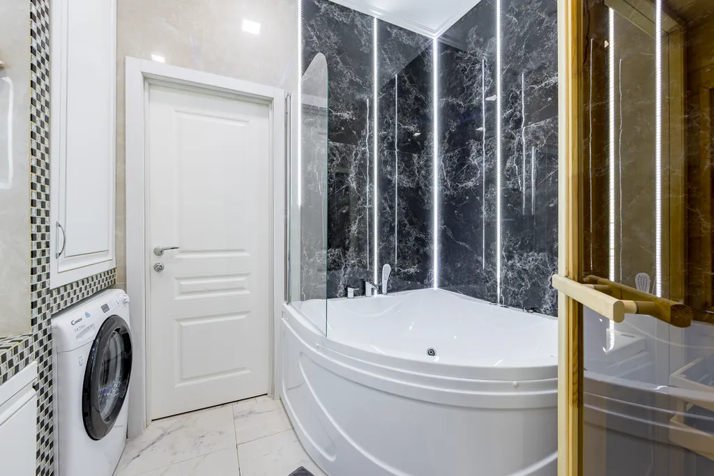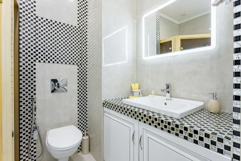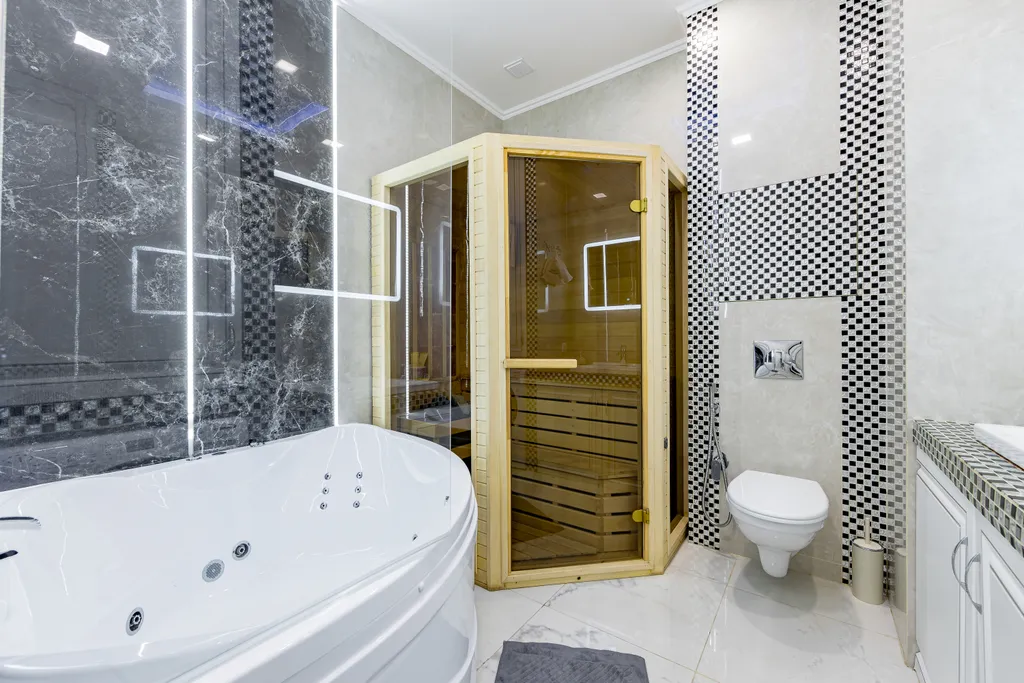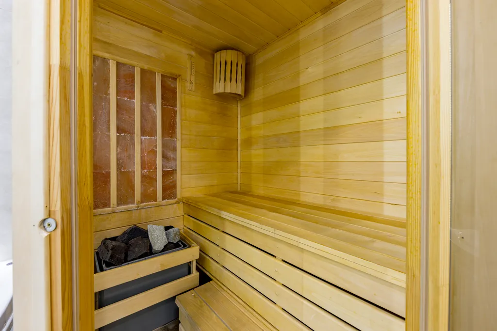 - Особым преимуществом является наличие полноценной финской сауны для двоих и ванны джакузи с гидромассажем, предоставляющих возможность расслабиться и отдохнуть вдвоем.