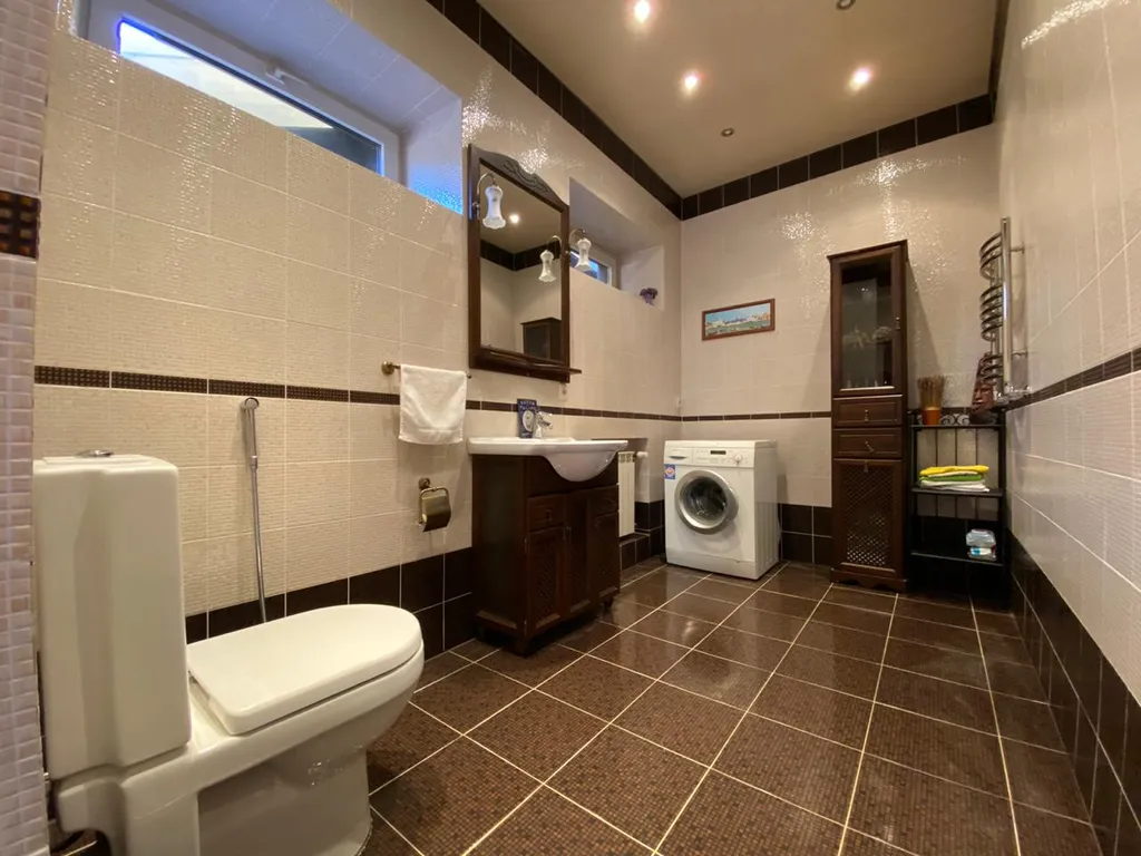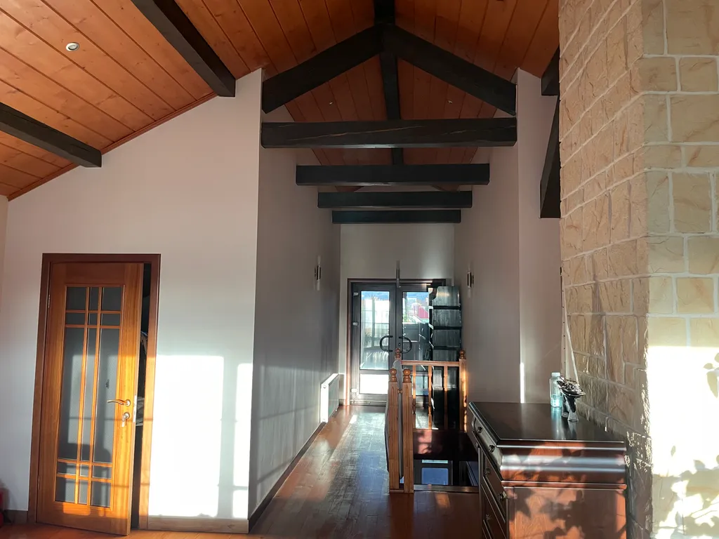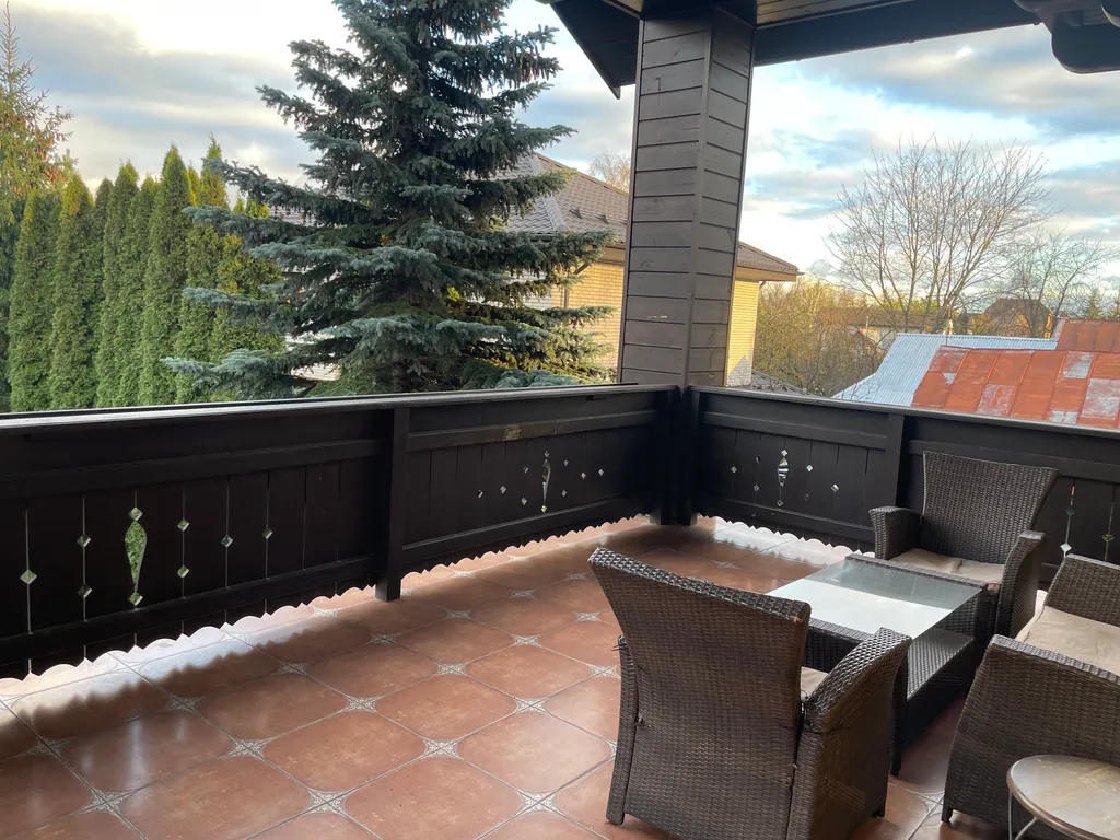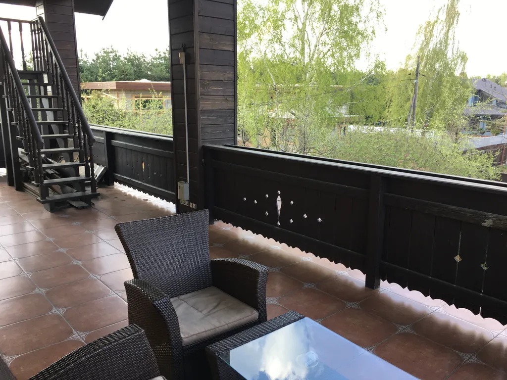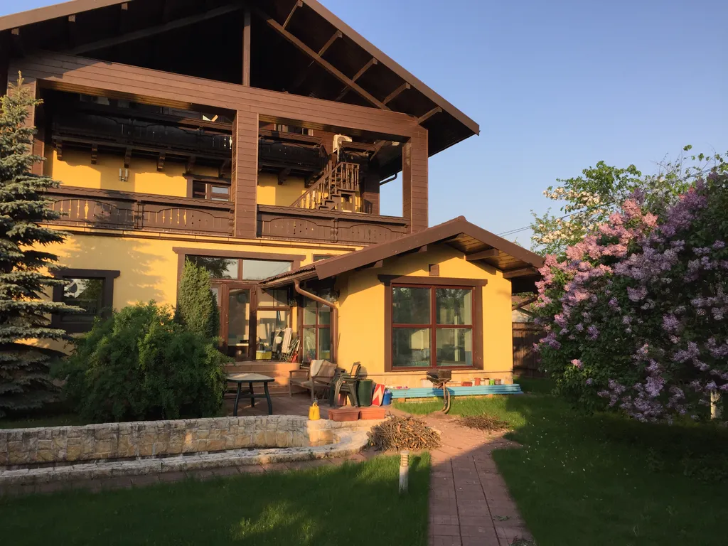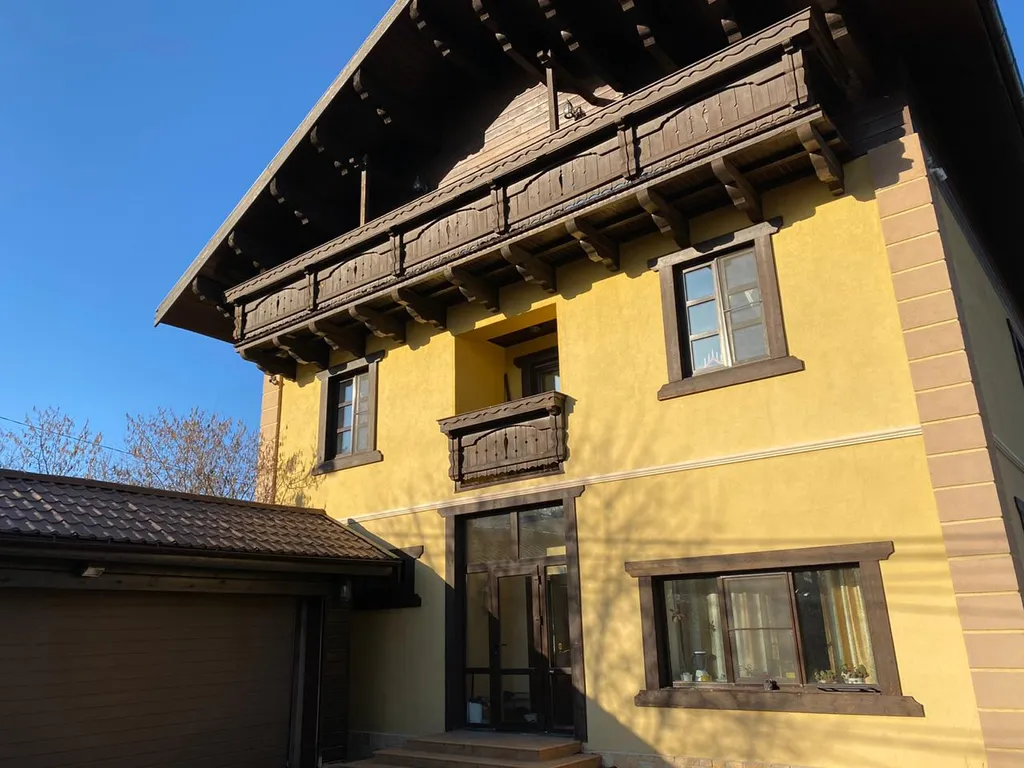Дом построен в стиле Тирольского шале, экстерьер дома подчеркивают массивные балконы и террасы с которых открывается отличный вид на зеленый поселок. Как и экстерьер, интерьер имеет альпийскую тему. Красивая мебель и хороший ремонт подчеркивают красоту этого дома.