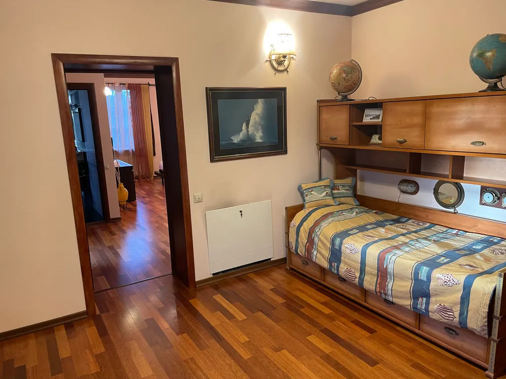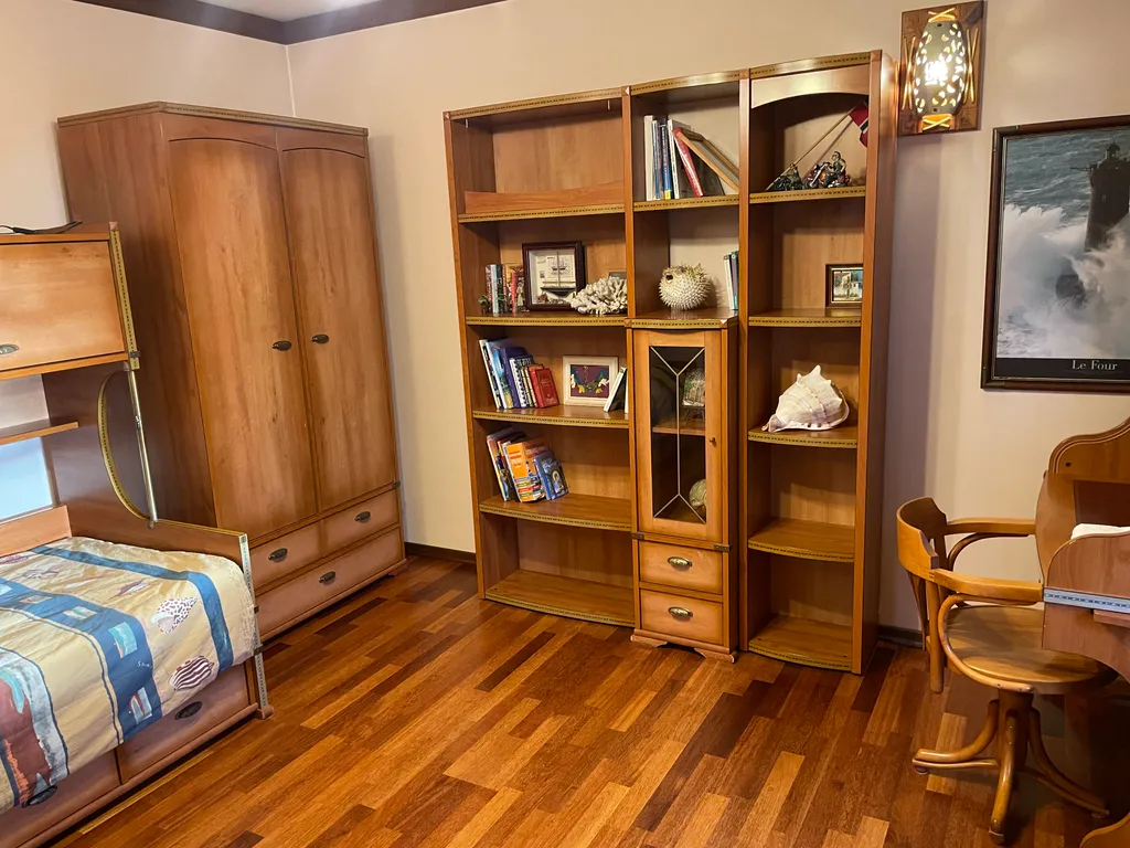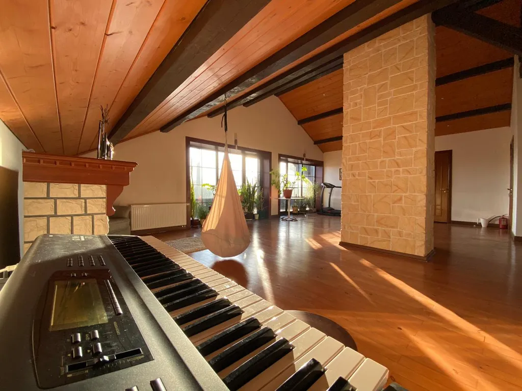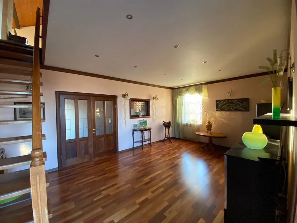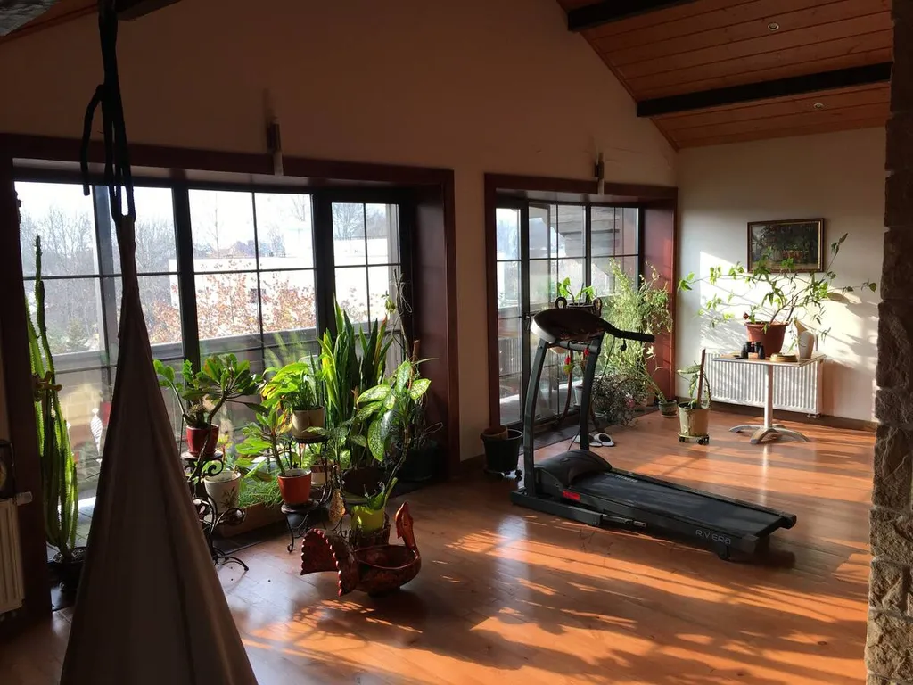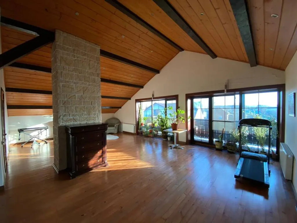 Дом построен в стиле Тирольского шале, экстерьер дома подчеркивают массивные балконы и террасы с которых открывается отличный вид на зеленый поселок. Как и экстерьер, интерьер имеет альпийскую тему. Красивая мебель и хороший ремонт подчеркивают красоту этого дома.