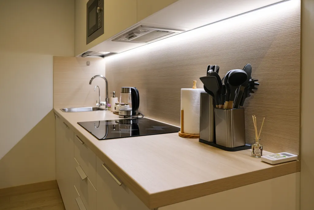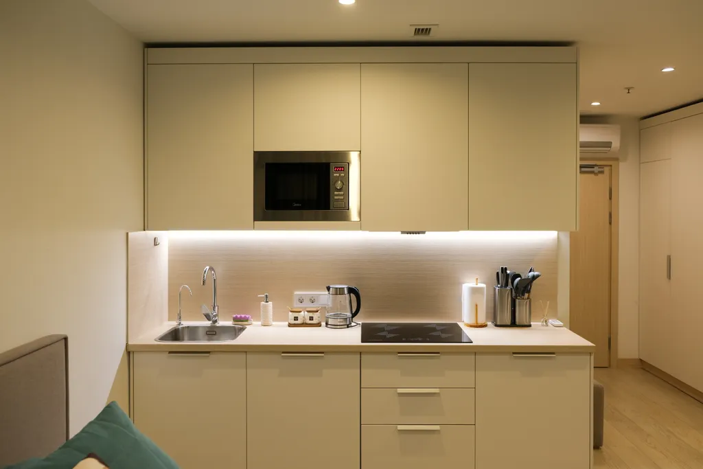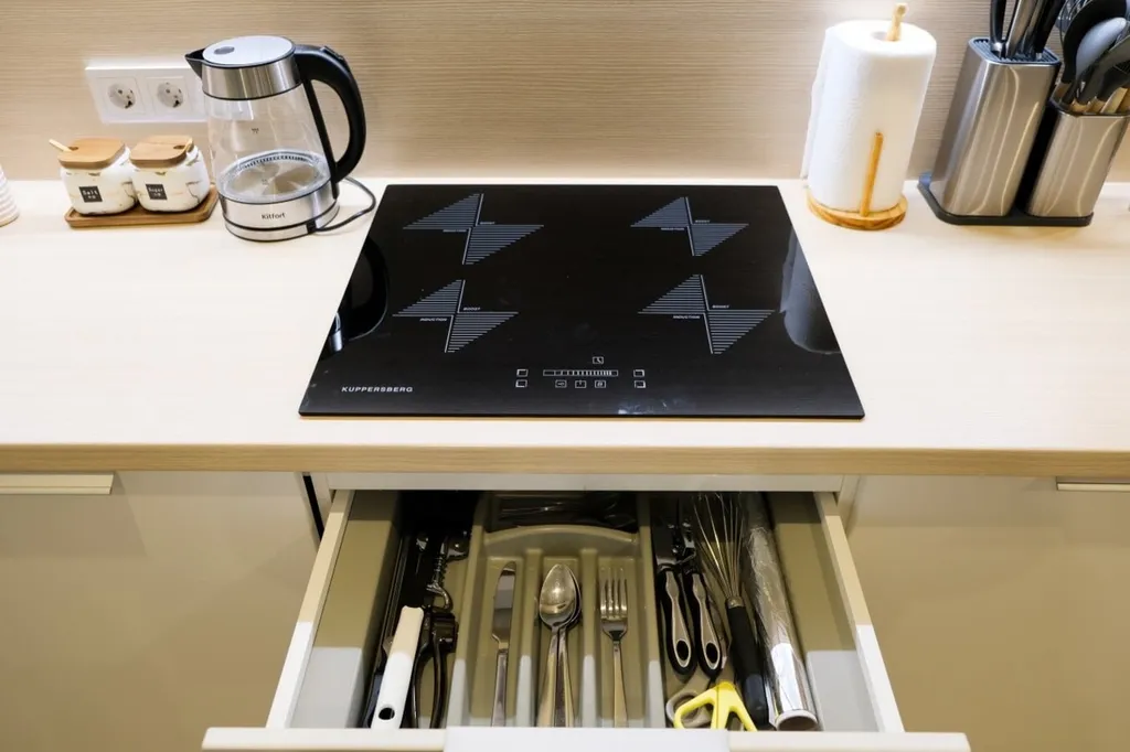 Кухонное пространство полностью оборудовано бытовой техникой и посудой(духовой шкаф, индукционная плита, микроволновая печь, посудомойка, холодильник)также ваша кухня оборудованна фильтром с питьевой водой.