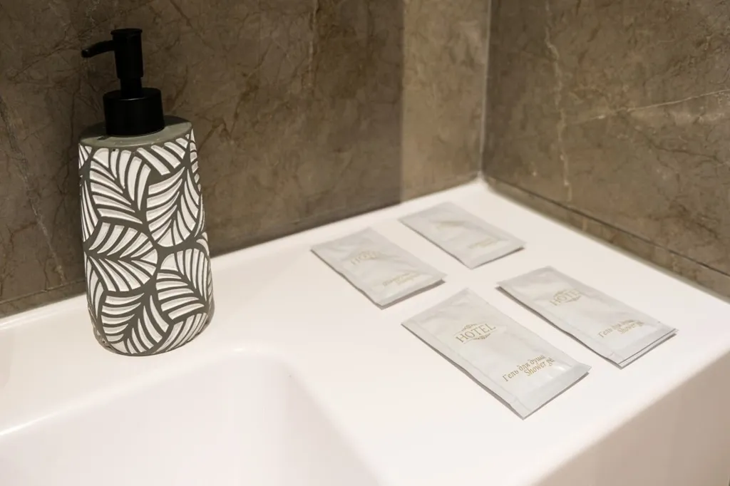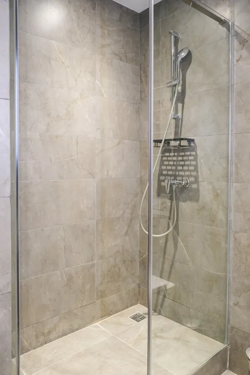 Прекрасная ванная комната с большой душевой. Есть полотенца, гель для душа, шампунь, жидкое мыло, одноразовые тапочки, фен, утюг, гладильная доска, средство для мытья посуды и др.