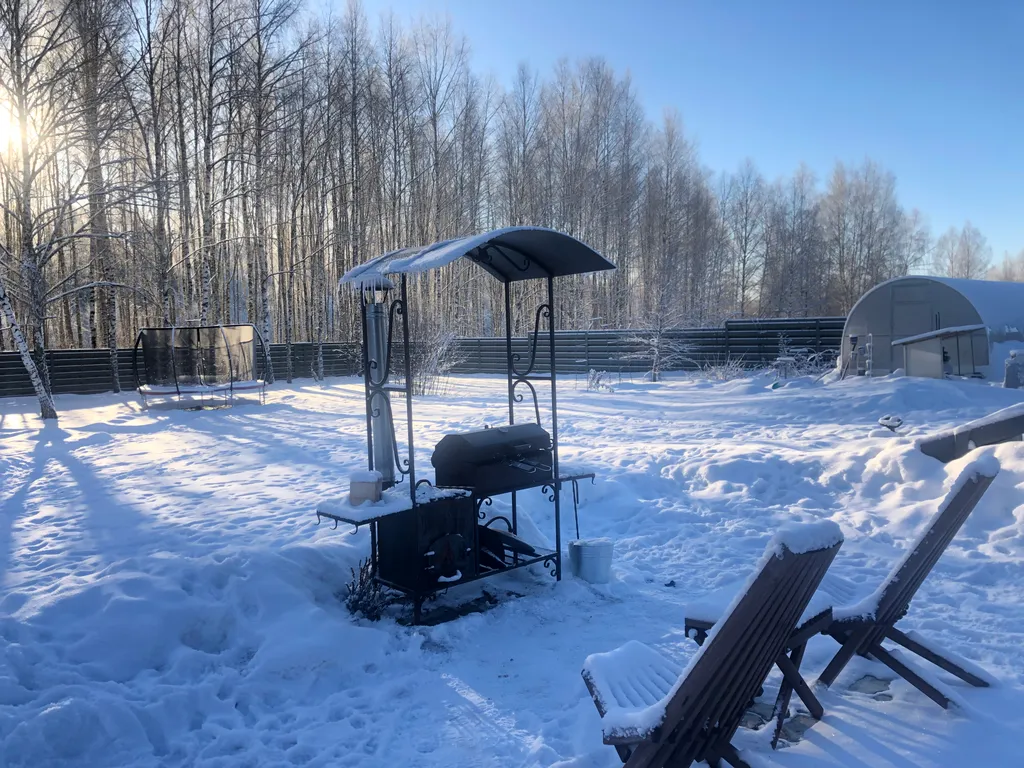 Мангал с термо-крышкой и печью под казан, оснащён шампурами, решетками для гриля, казаном. Дрова, уголь для мангала необходимо привозить с собой (или договариваться о предоставлении).