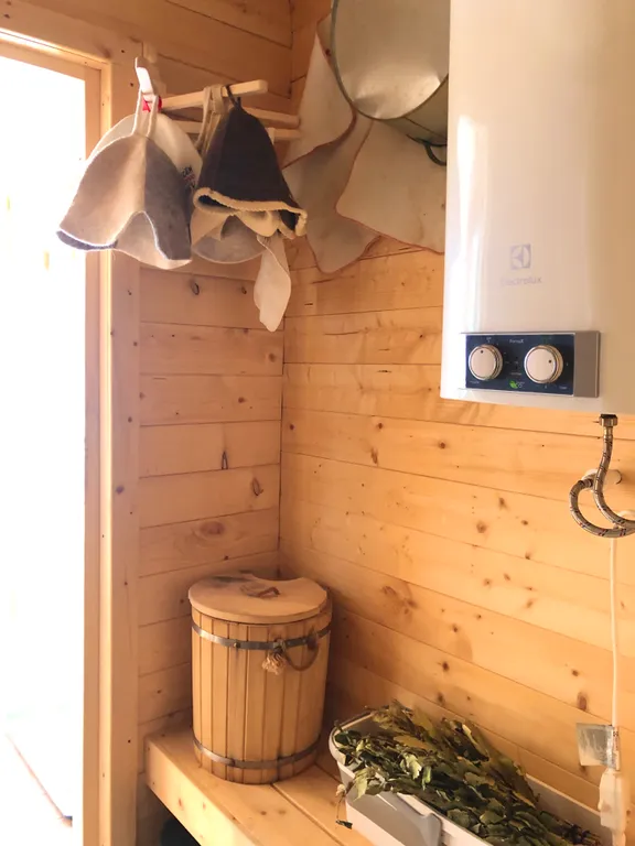 Баня с комнатой отдыха. Арендуется за доп. Плату, предоставляется базовое количество дров, веник, травы, трав. Чай, аромо-масла, шапки, полотенца.