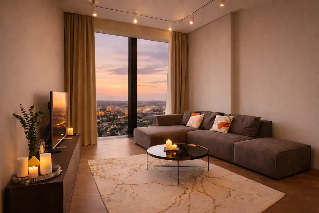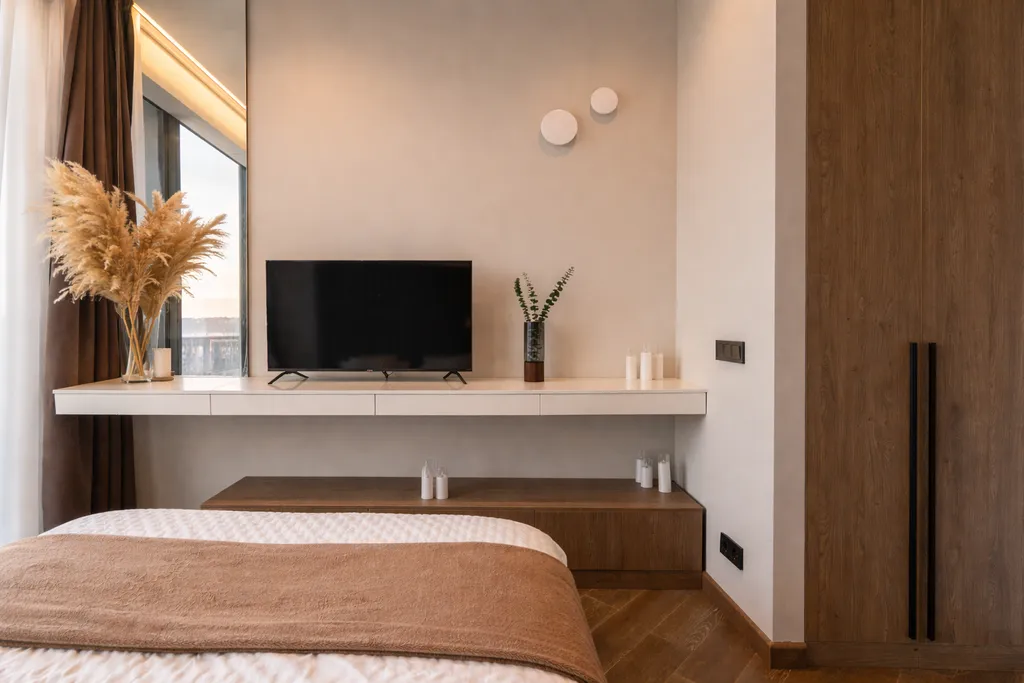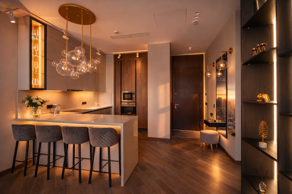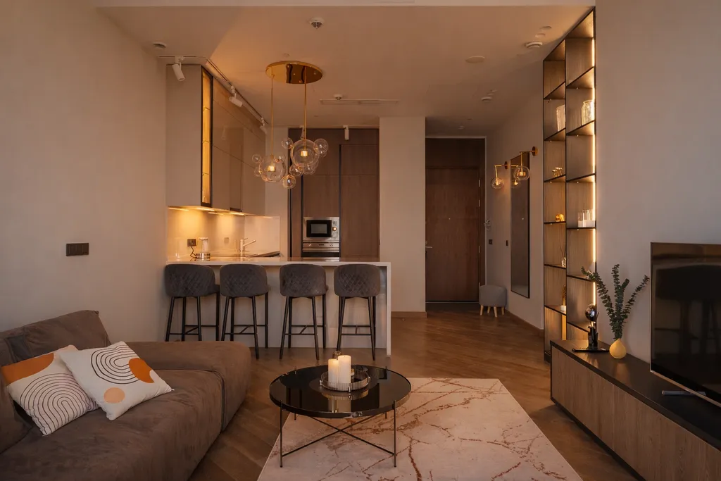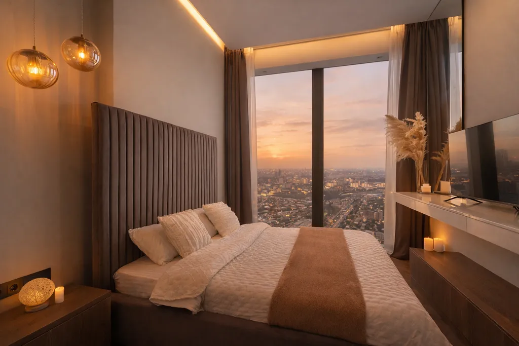 Апартамент с шикарным видом на город, оборудован качественной мебелью и дорогим оборудованием, идеально подойдет как для приятного времяпровождения со второй половинкой, так и для долгого проживания, дизайн апартамента в сочетании с его видом создает невероятный уют и комфорт.