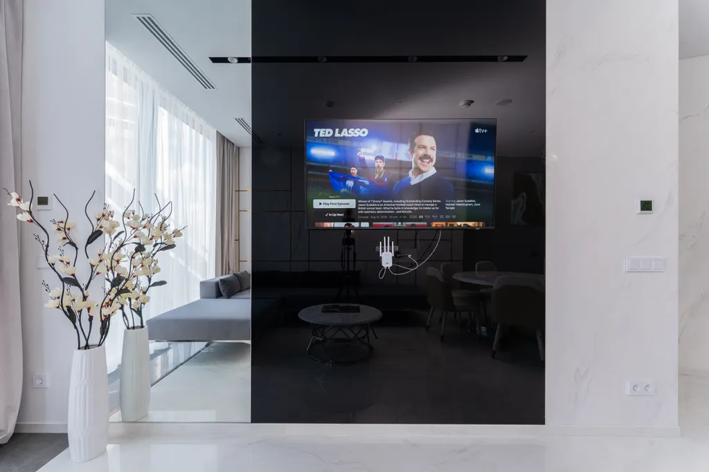- Огромный 75-дюймовый телевизор с функцией smart tv,