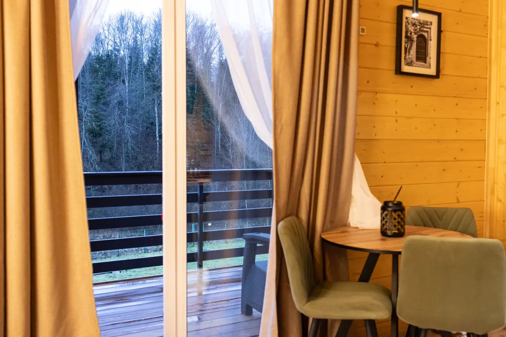 • Спальная комната с панорамными окнами, выходом на веранду и видом на лес