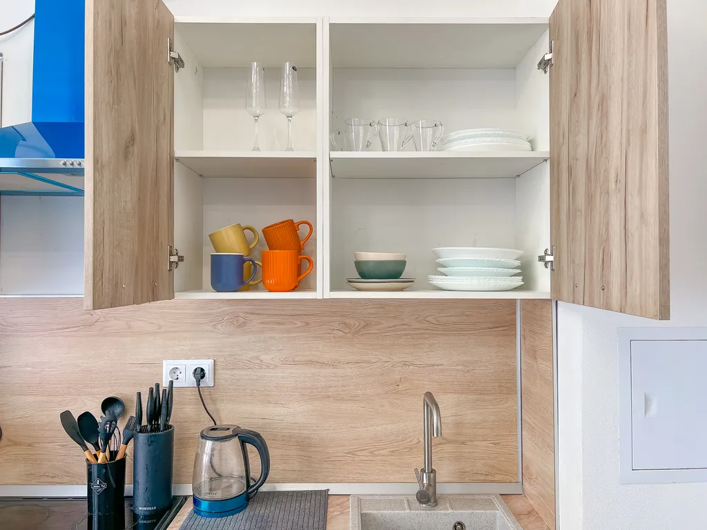 - Бытовая техника: электрическая плита, микроволновая печь, холодильник, чайник, стиральная машина, фен, утюг;