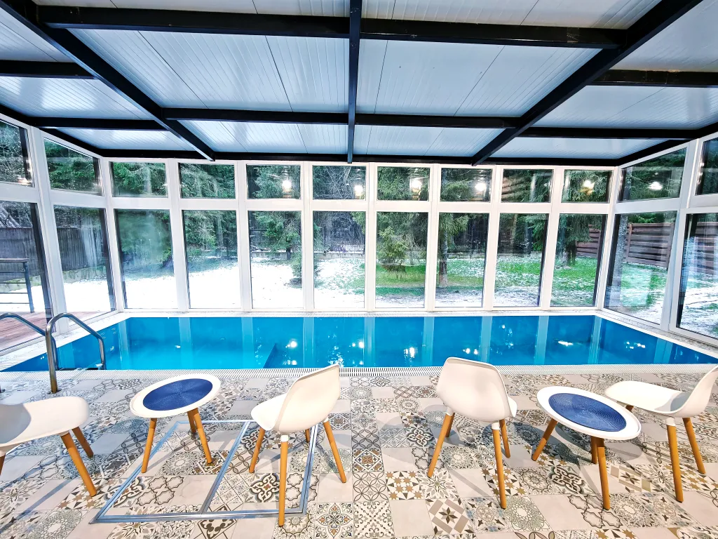 Теплый бассейн с сауной и кухней, большая гостиная 50 м2 для проведения мероприятий.