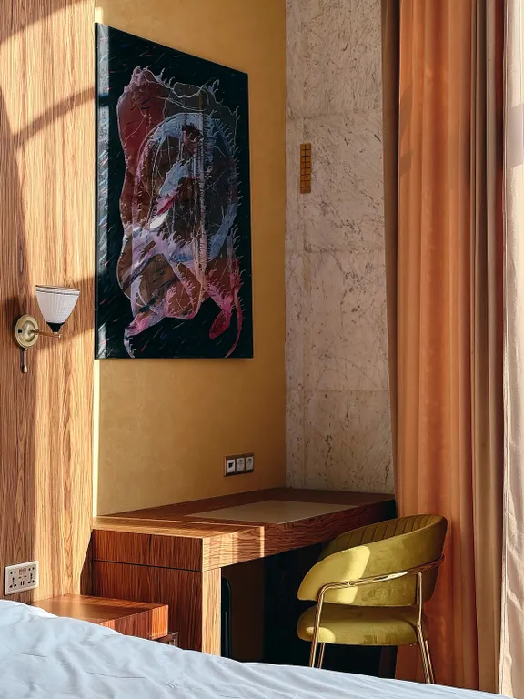 Имеет спальню с приятным интерьером.