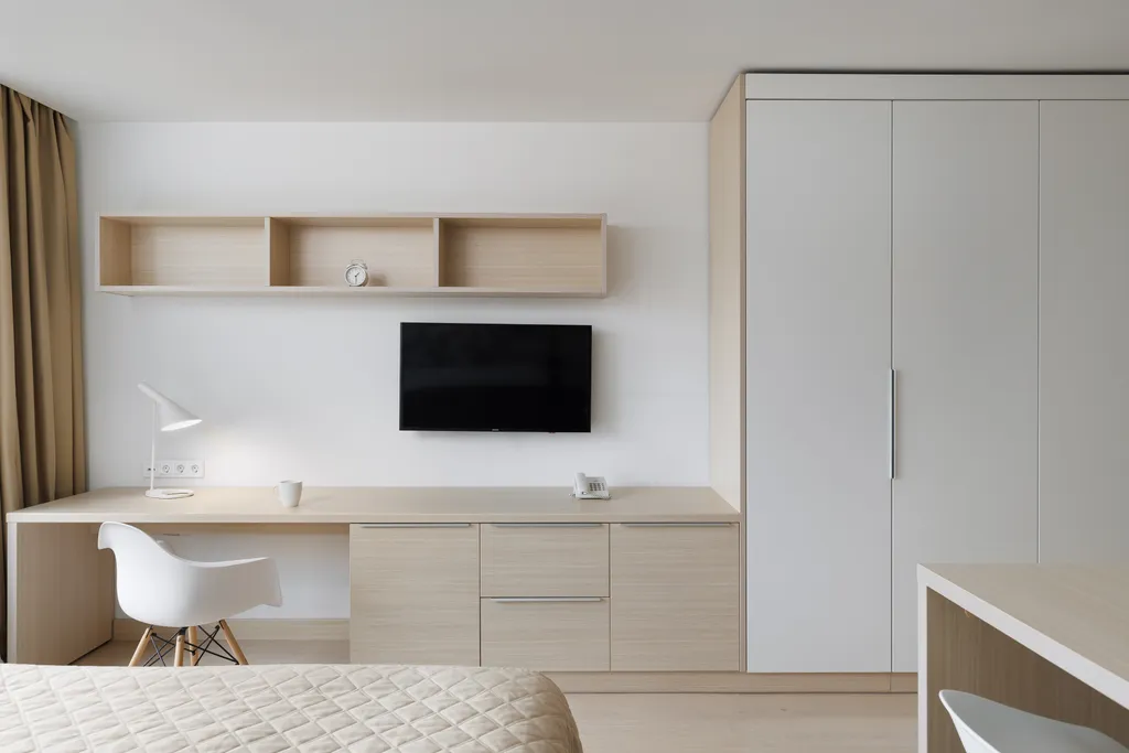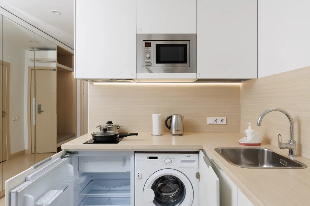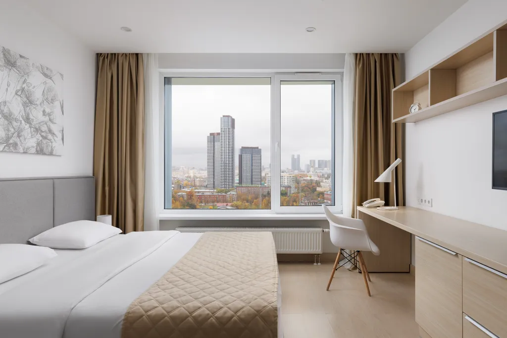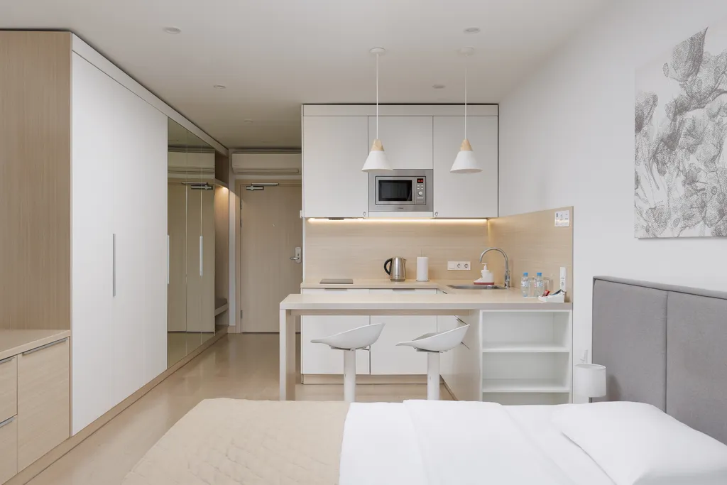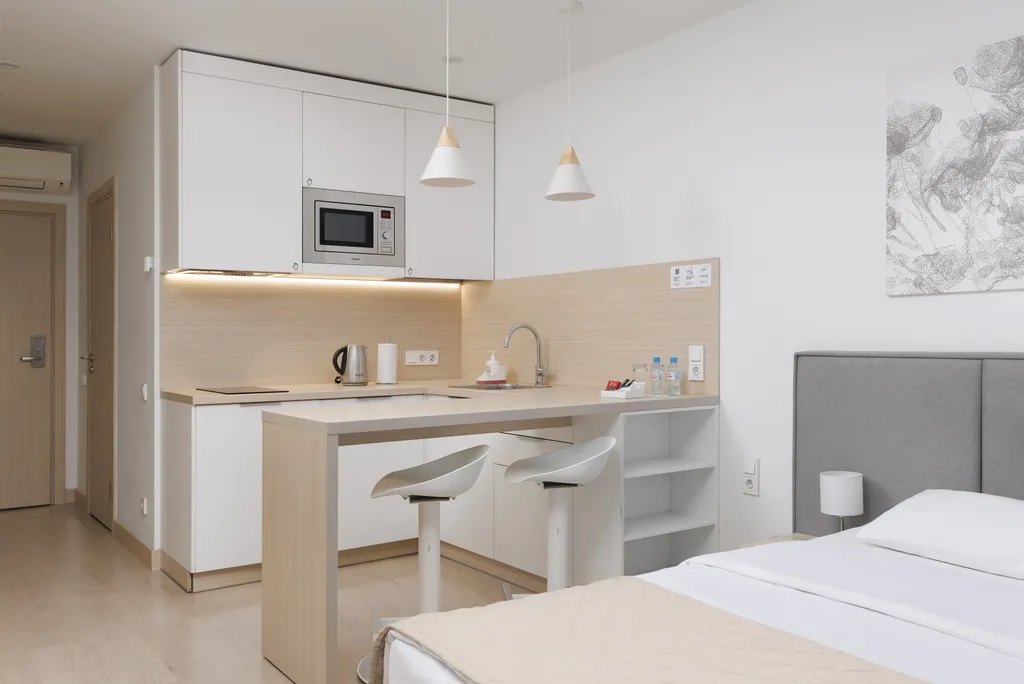 Современный гостиничный номер, оборудованный всем необходимым и полноценной кухней, которая позволяет рассматривать данный вариант размещения и в формате среднесрочного и долгосрочного пребывания.