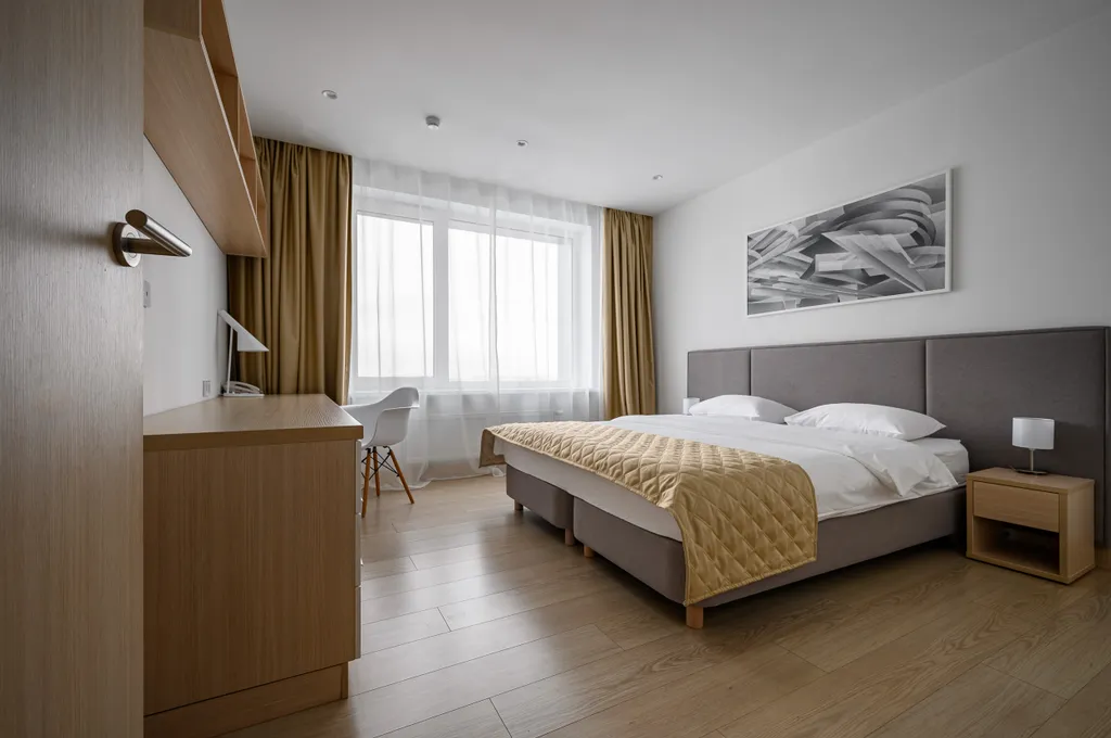 В спальнях одна двуспальная или две односпальных кровати на выбор;