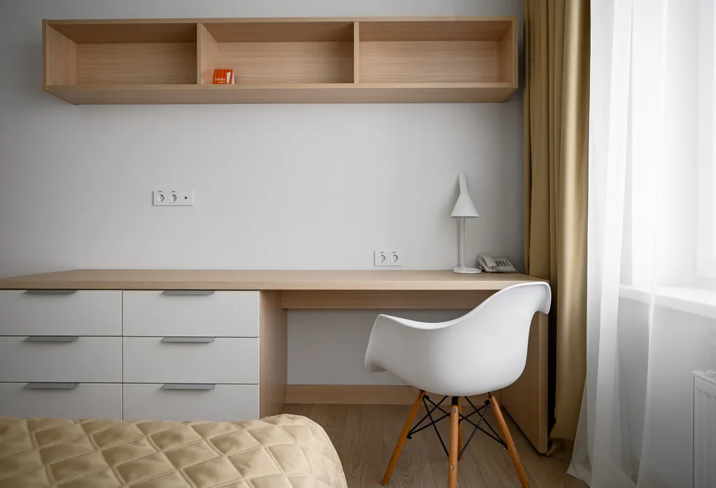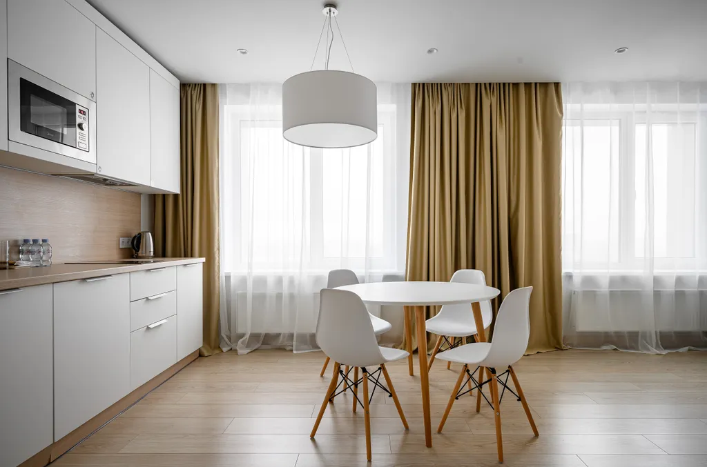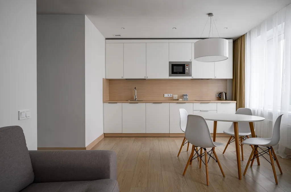 Рабочая и кухонная зоны. Кухонная зона оснащена: варочной панелью, вытяжкой, микроволновой печью, холодильником, электрочайником, посудой для приготовления и употребления пищи;