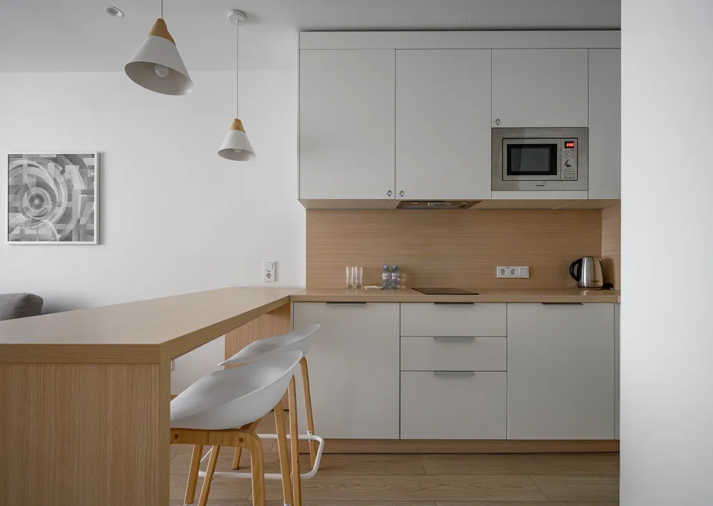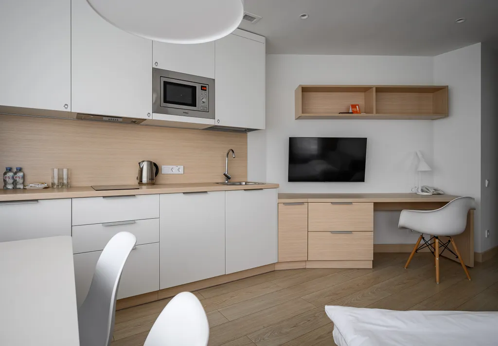 Рабочая и кухонная зоны. Кухонная зона оснащена: варочной панелью, вытяжкой, микроволновой печью, холодильником, электрочайником, посудой для приготовления и употребления пищи;