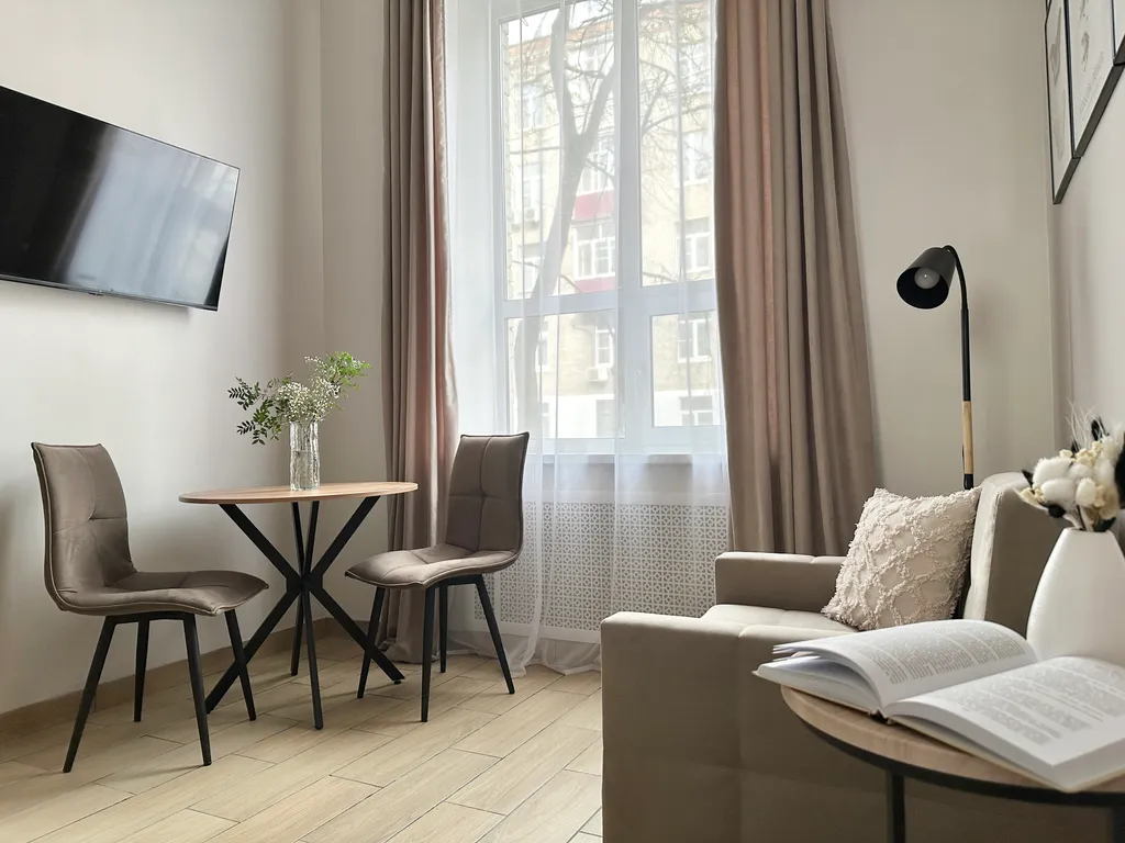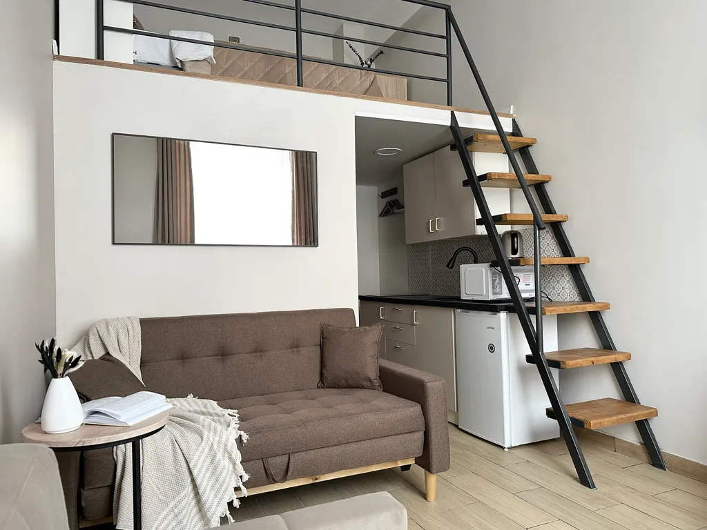 Для гостей URoom апарт отель, предлагаются комфортабельные апартаменты, в которых есть все необходимое, для уютного и комфортного проживания. Все апартаменты имеют два уровня, на втором уровне, располагается спальная зона, на первом уровне есть кухонная зона со всем необходимым для приготовления еды, гостиная зона с мягким диваном и телевизором и санузел.