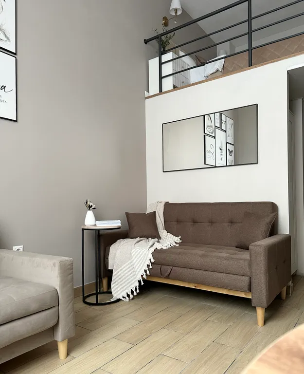Двухспальная кровать 160*200 на втором ярусе. В гостиной зоне раскладывающийся диван и кресло-кровать.
