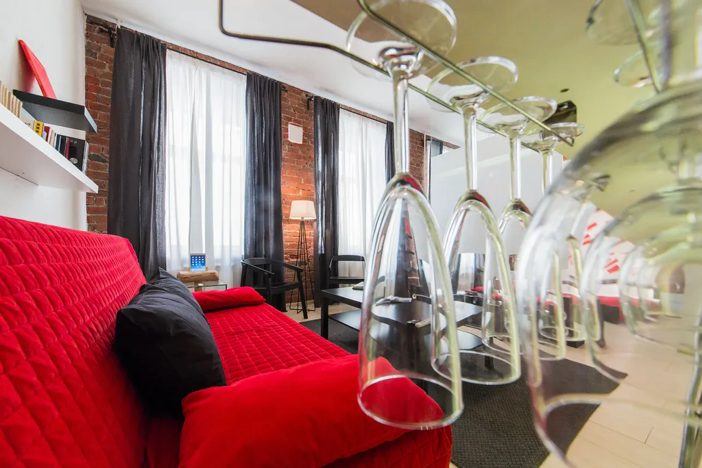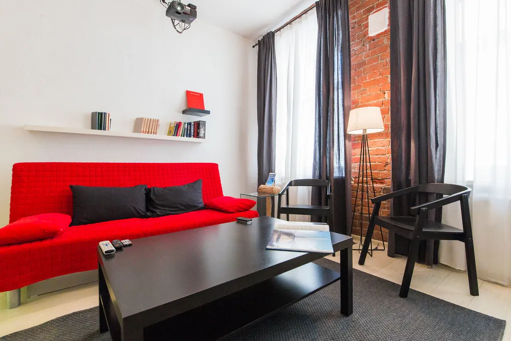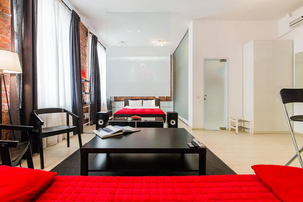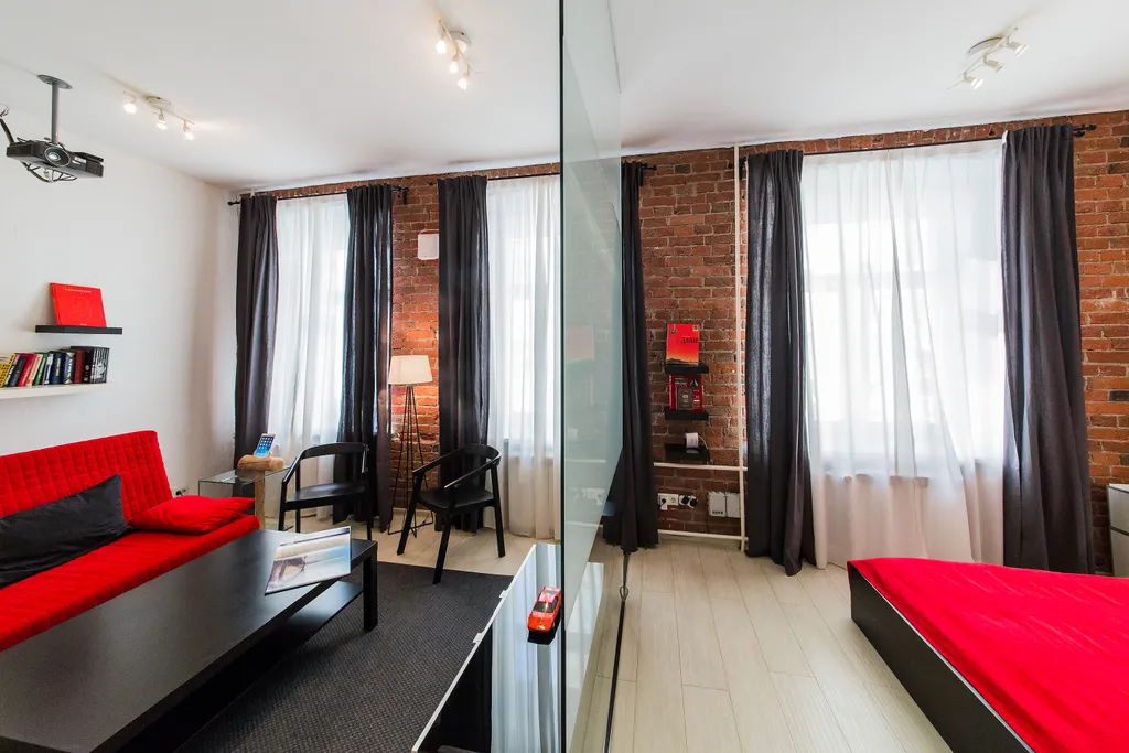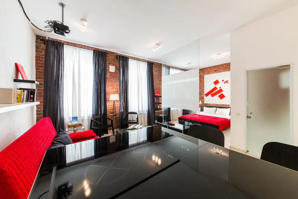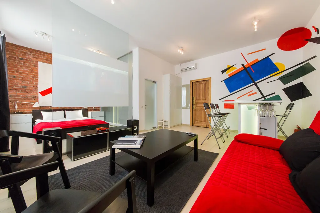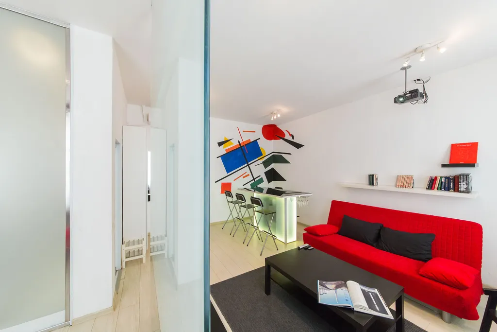 В нашей студии площадью в 45 кв.м. Вы найдете: 4 комфортных спальных мест, душ, фен, барную стойку, холодильник и микроволновку, утюг и гладильную доску, домашний кинотеатр, стереосистему, Apple TV, 110-тв.каналов на проекции диагональю 3,5 метра, мини-библиотеку - от комиксов Эрже до поучений аввы Дорофея (а так же огромные альбомы по фото и живописи), бесплатный 30-мегабитный wi-fi и все это в непосредственной близости от Чистых прудов, Кремля и, разумеется, бесконечного количества уютных кафе и баров.
