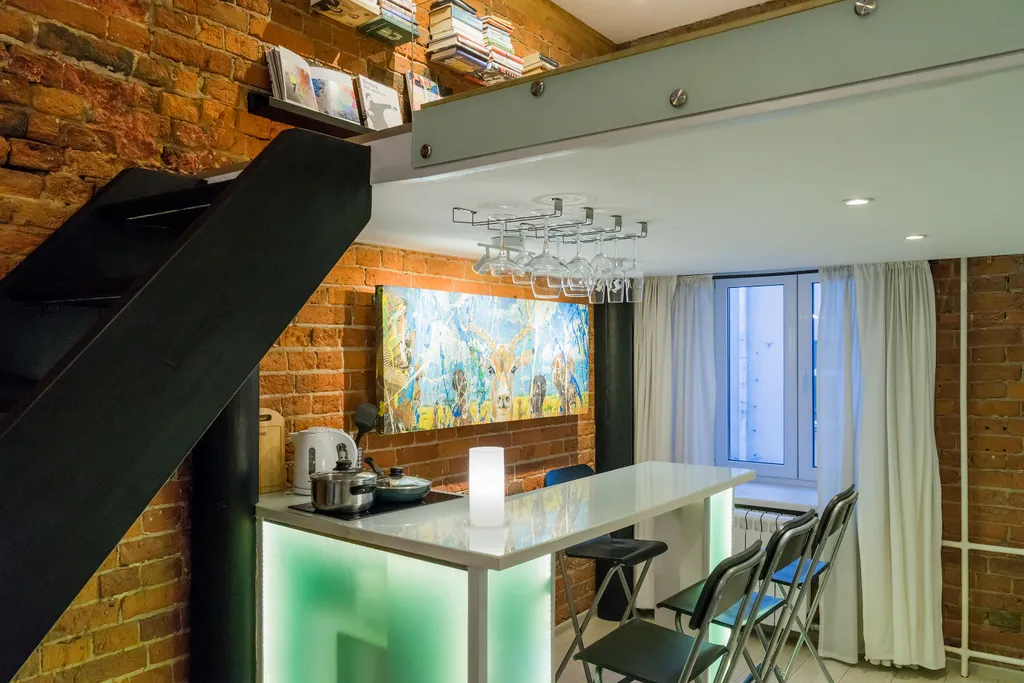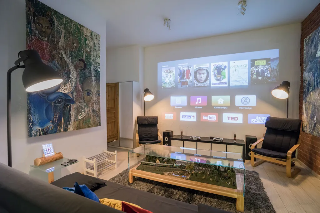 В нашей студии площадью в 37 кв.м. Вы найдете: 4 комфортных спальных мест, душ, фен, барную стойку, холодильник и микроволновку, утюг и гладильную доску, домашний кинотеатр, стереосистему, Apple TV, 110-тв.каналов на проекции диагональю 3,5 метра, мини-библиотеку - от комиксов Эрже до поучений аввы Дорофея (а так же огромные альбомы по фото и живописи), бесплатный 30-мегабитный wi-fi и все это в непосредственной близости от Чистых прудов, Кремля и, разумеется, бесконечного количества уютных кафе и баров.