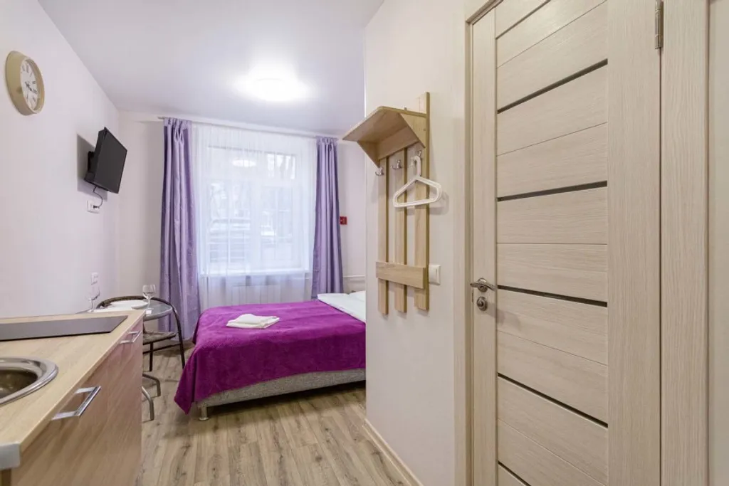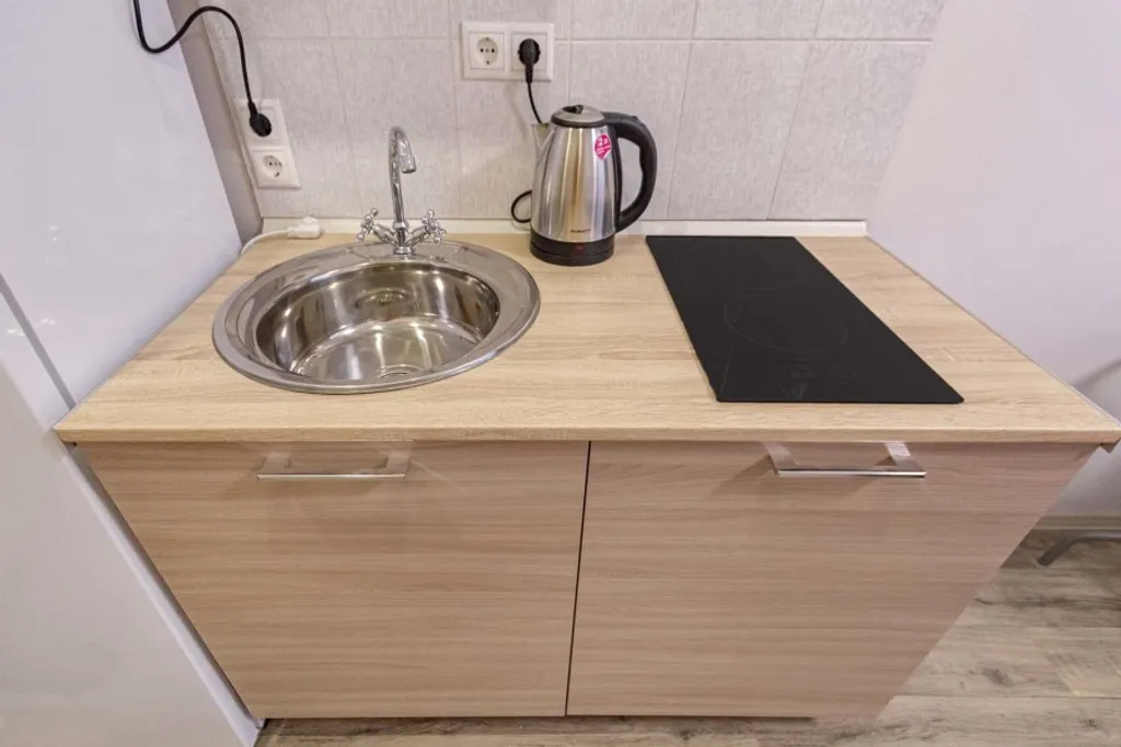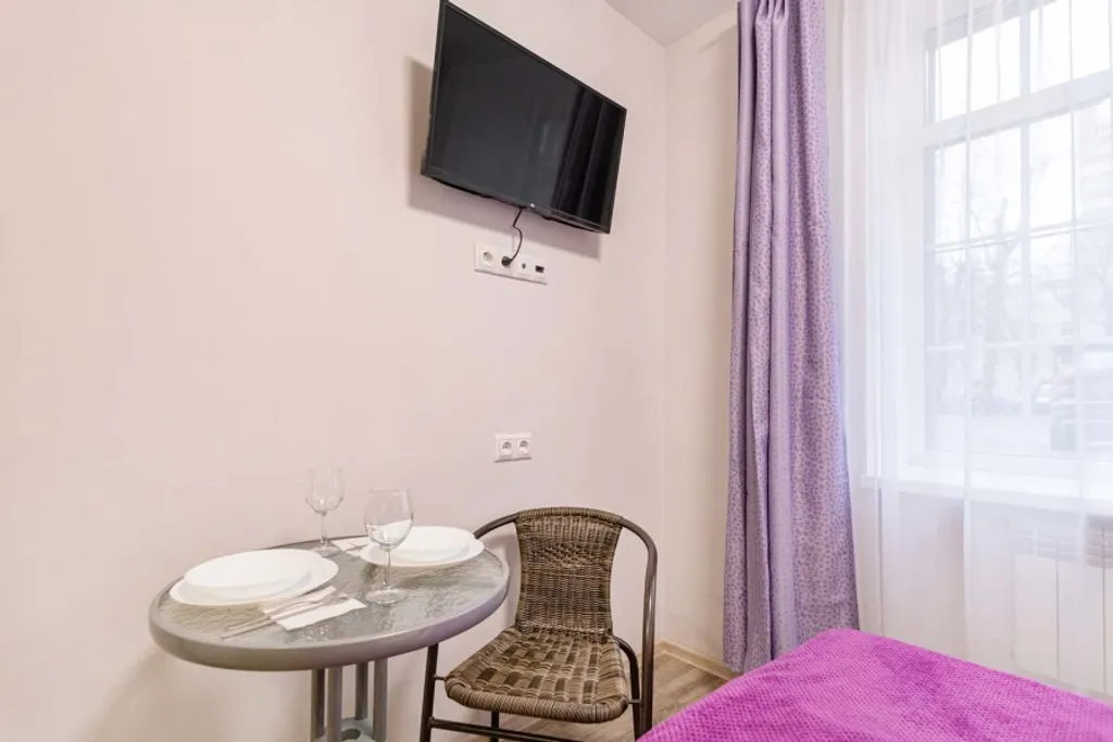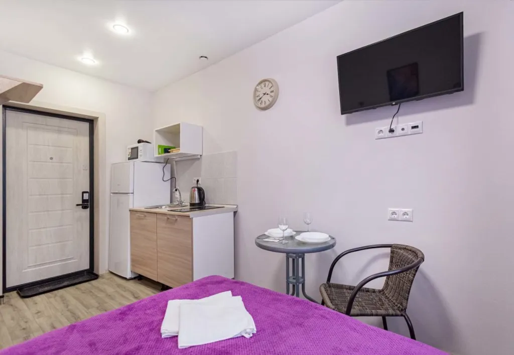 - Апартаменты укомплектованы электрической плитой, чайником, телевизором, холодильником и микроволновкой.