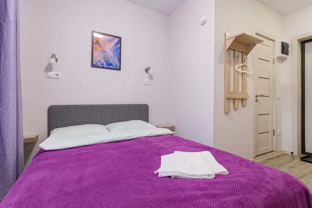 - Квартира с современным дизайном оборудована двуспальной кроватью с ортопедическим матрасом, блэкаут шторами, чистым постельным бельем, тапочками, посудой на 2 персоны и Wi-Fi с заботой о Вашем комфорте.
