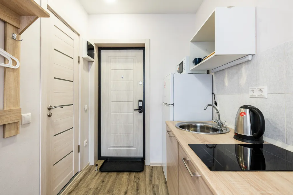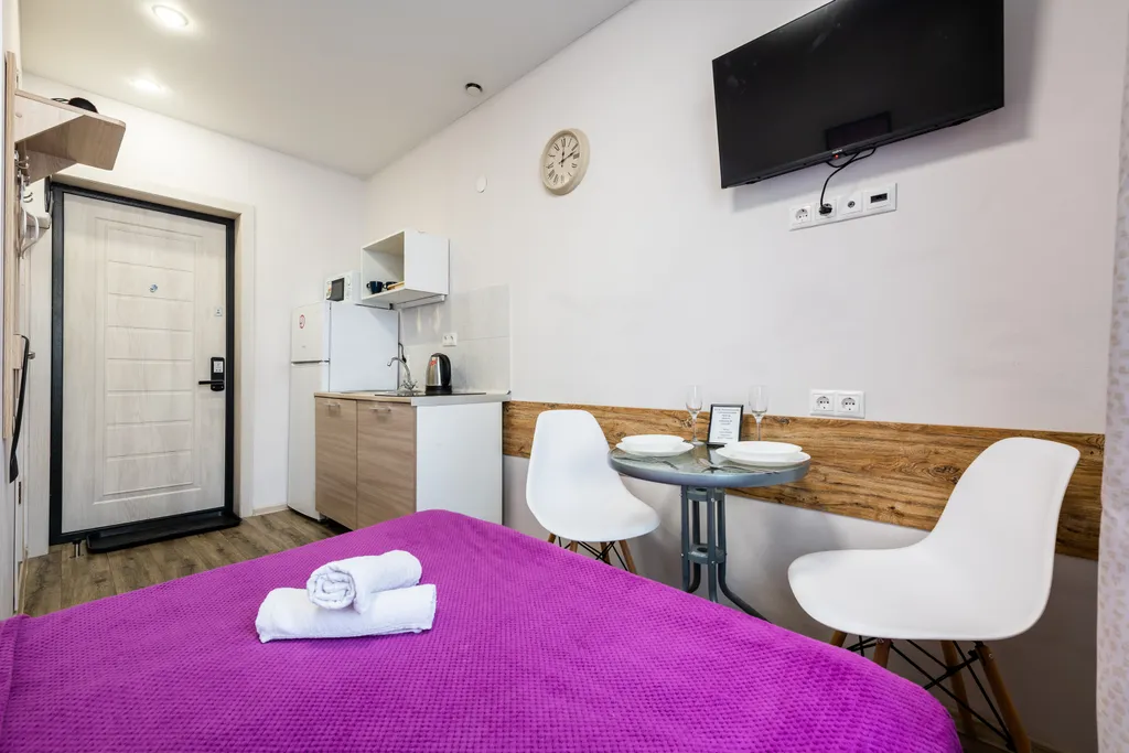 - Апартаменты укомплектованы электрической плитой, чайником, телевизором, холодильником и микроволновкой.