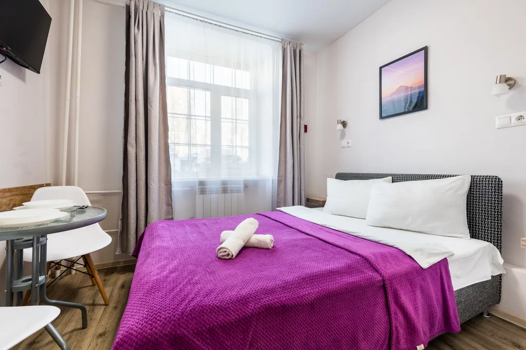 - Квартира с современным дизайном оборудована двуспальной кроватью с ортопедическим матрасом, блэкаут шторами, чистым постельным бельём, тапочками, посудой на 2 персоны и wi-fi с заботой о вашем комфорте.
