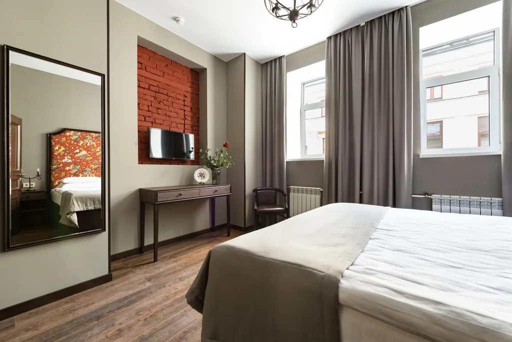 • Интерьер номеров выполнен в приятной современной теплой цветовой гамме;