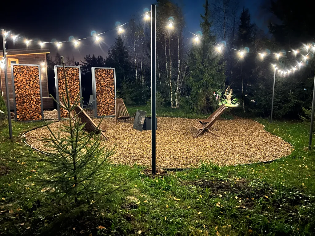 Большая костровая зона, окруженная лесом.