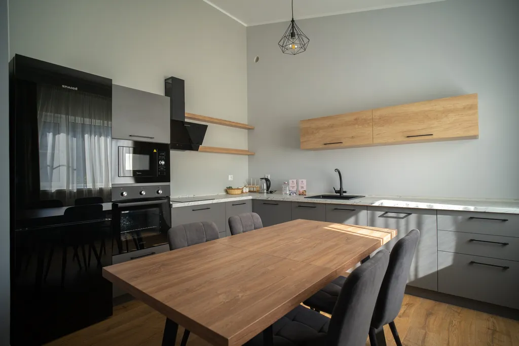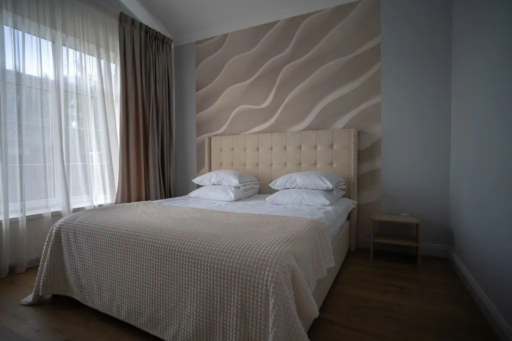 Коттедж с двумя изолированными спальнями (одна — с двуспальной, вторая — с двумя односпальными кроватями), постирочной комнатой с гардеробом, кухней со столовой зоной и гостиной. Комфортная вместимость — 4 человека (возможна организация двух дополнительных мест за отдельную плату).