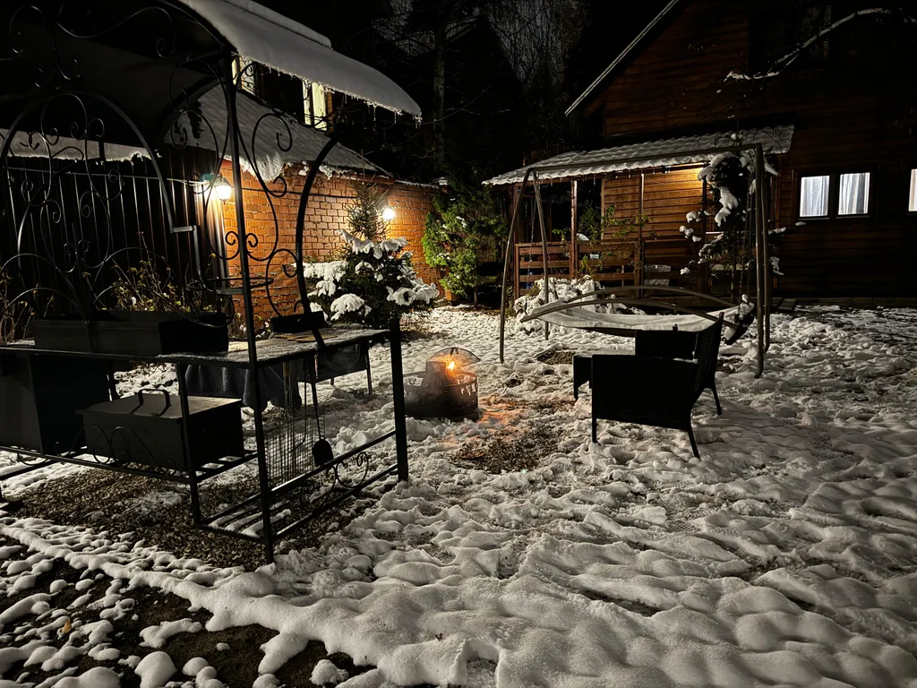 Есть костровая чаша, в которой можно разводить костёр. Сетка дров включена в стоимость.