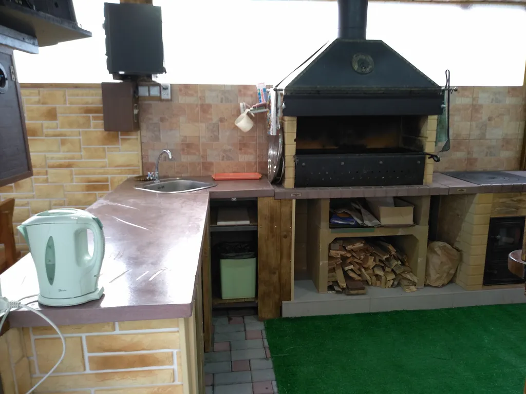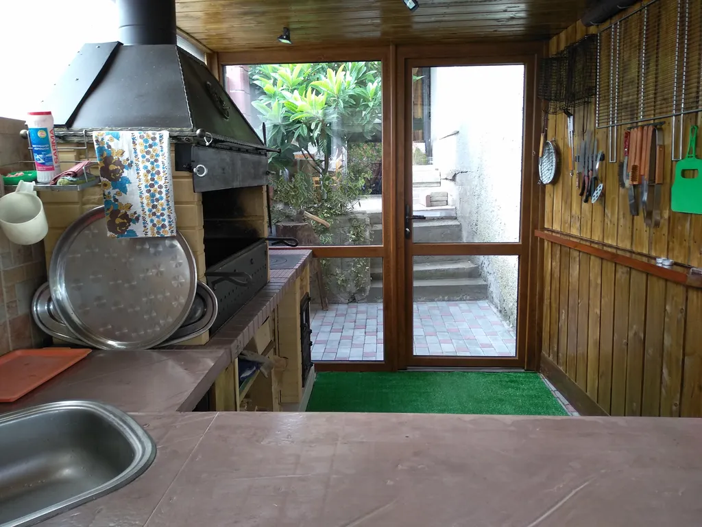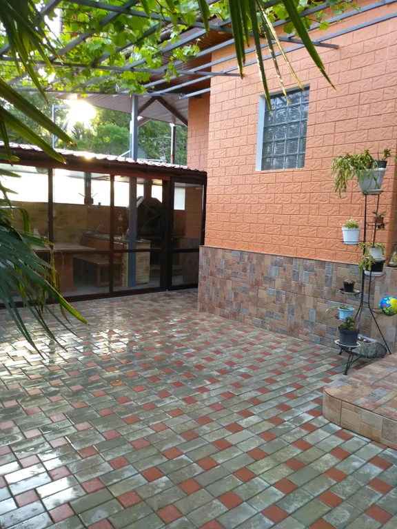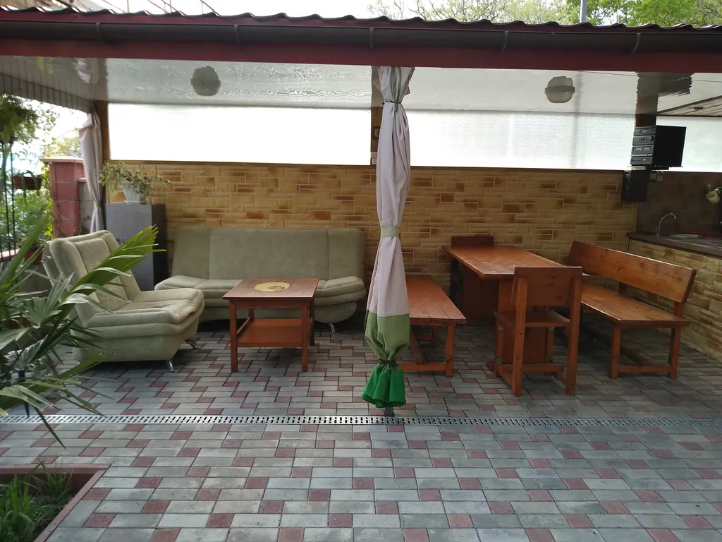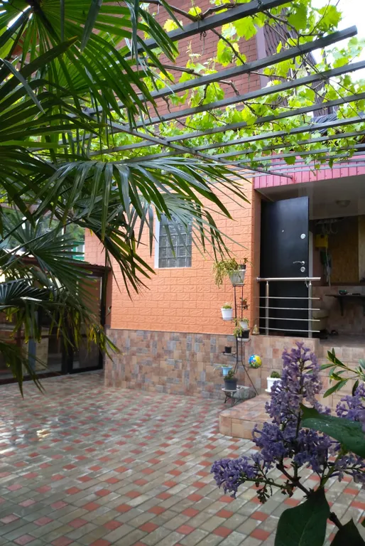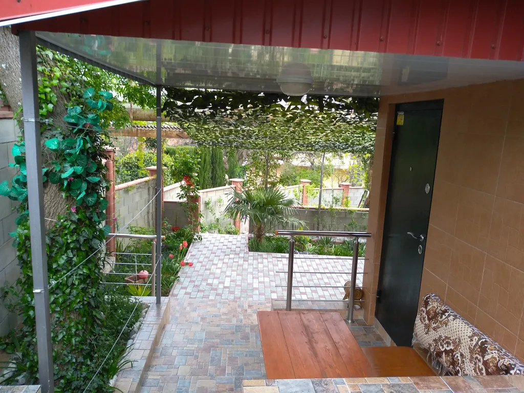 Домик располагается на зеленом участке, в окружении субтропических растений. Есть мангал, навес со столом, лавками, диваном ( при желании можно спать на свежем морском воздухе); телевизором,вечернее освещение двора. Продуктовый магазин и остановка - 2 мин пешком.