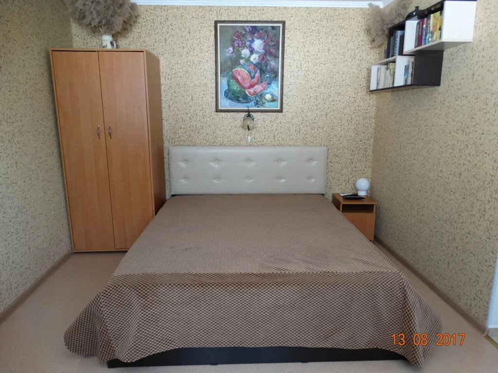 Спальня: 1 кровать двуспальная 1,60 и 1,80 шир., 2 прикроватные тумбочки, платяной шкаф, ЖК телевизор, кондиционер, раскладное кресло. Комплекты постельного белья и полотенца- предоставляем.