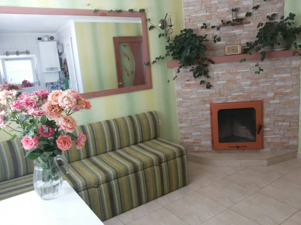 Комната- студия: камин, двухместный раскладной диван, столовый гарнитур, кухня (газ), холодильник, плита, микроволновка, фильтр для воды, вся необходимая посуда.