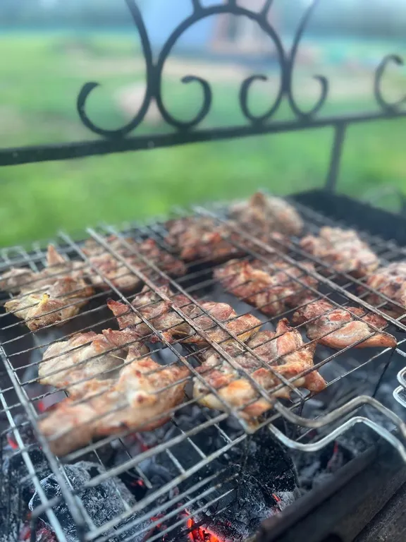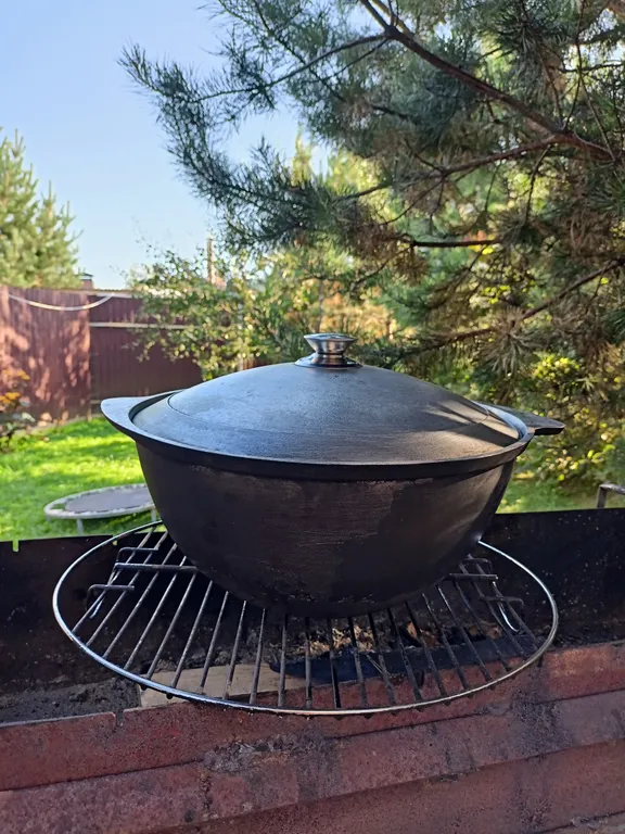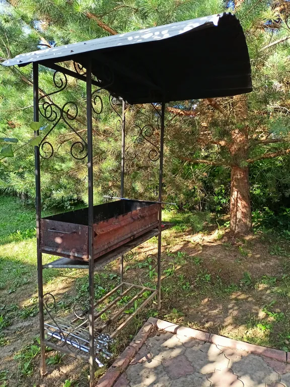 Есть все необходимое для приготовления блюд на костре (шампура, казан, решетка).