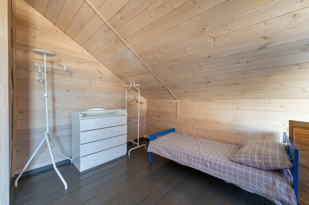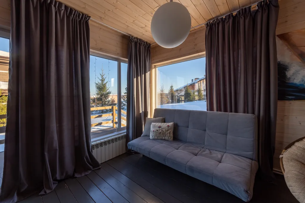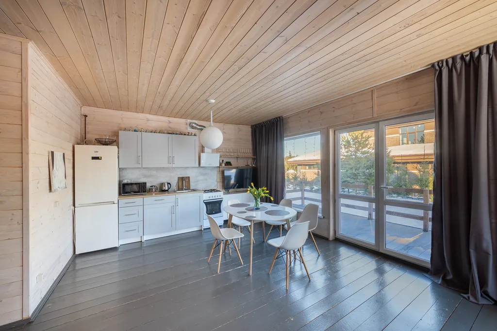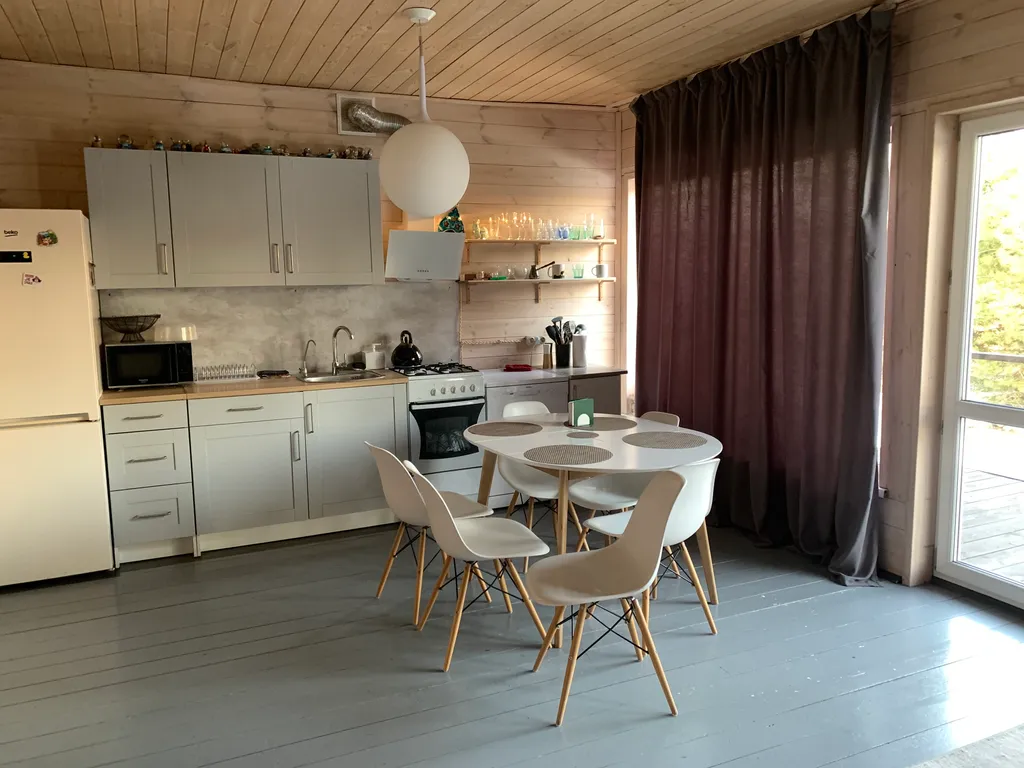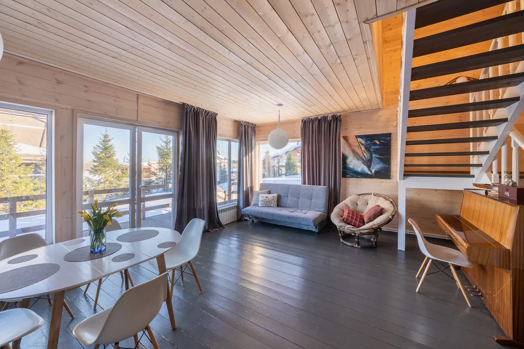 1 этаж — просторная кухня-гостиная, оборудованная всей необходимой бытовой техникой и посудой, раскладной диван — спальня с двухъярусной кроватью — настоящее пианино — санузел