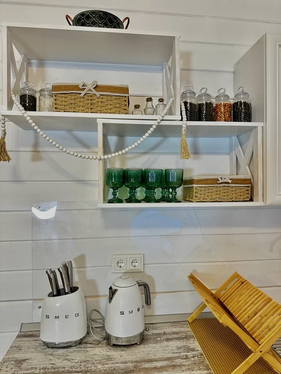 вся необходимая посуда (тарелки, чашки, бокалы, кастрюли, сковородка, столовые приборы, и т.д.)