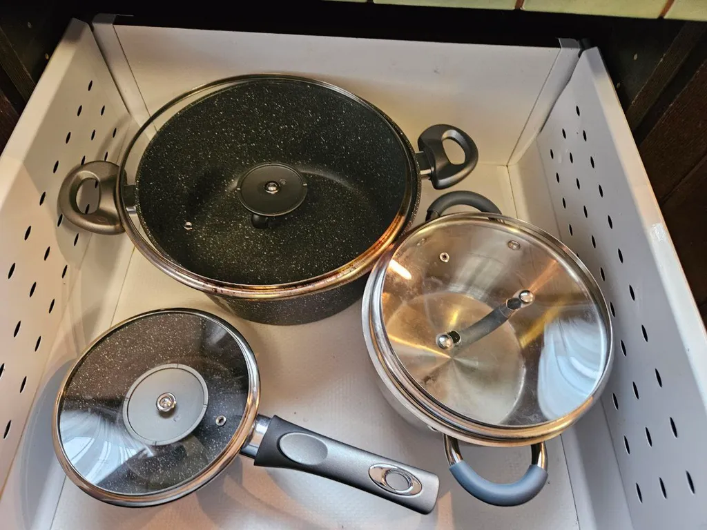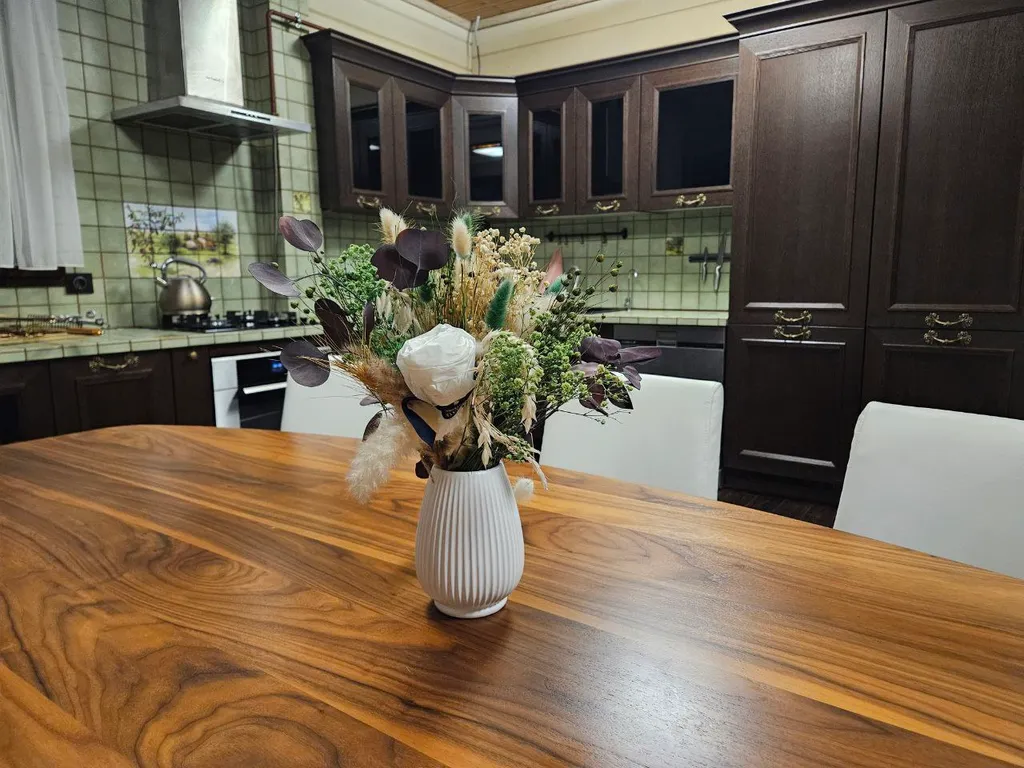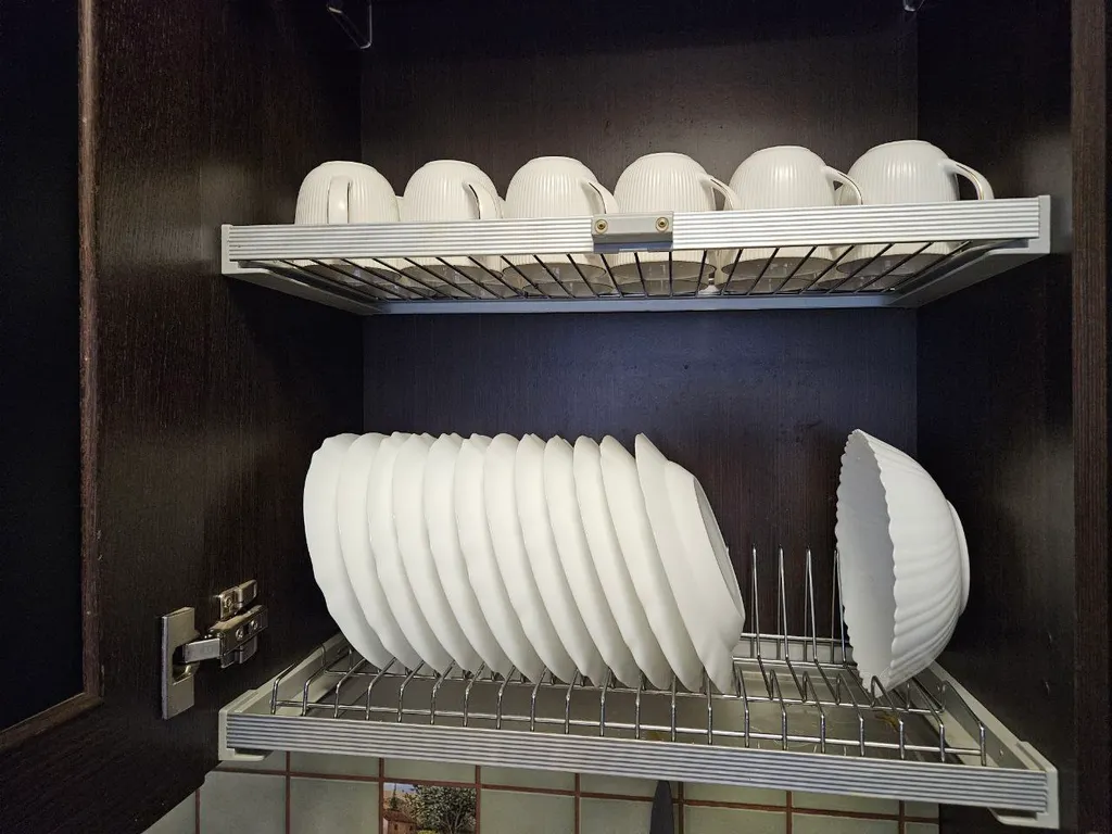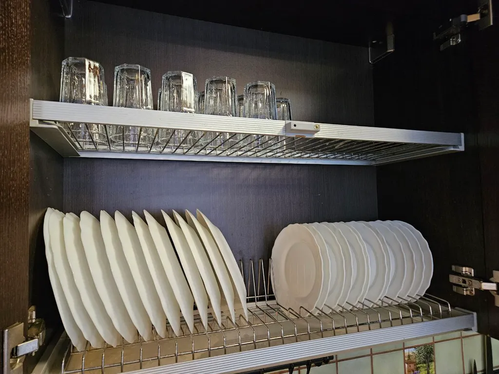 плита, духовка, холодильники с морозильниками, чайник, кофемашина, СВЧ, фильтр с питьевой водой. Есть чашки, бокалы, стаканы, тарелки, столовые приборы (все на 12 человек), сковородки, кастрюли, салатники, ножи и проч. Стол на 6-8 человек плюс раскладные стулья.