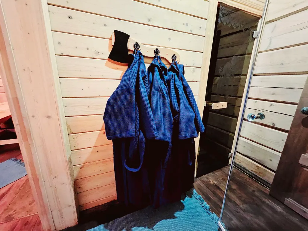 Баня вмещает до 6 человек; доплата 6000 руб. за все время. Входят халаты, полотенца, тапочки, травяной чай на 1 чайник, чашки для чая, стаканы для пива, гель для душа, дрова.