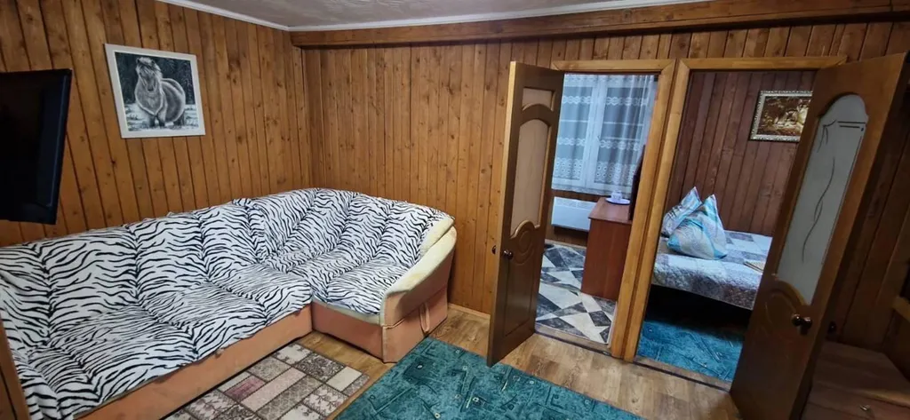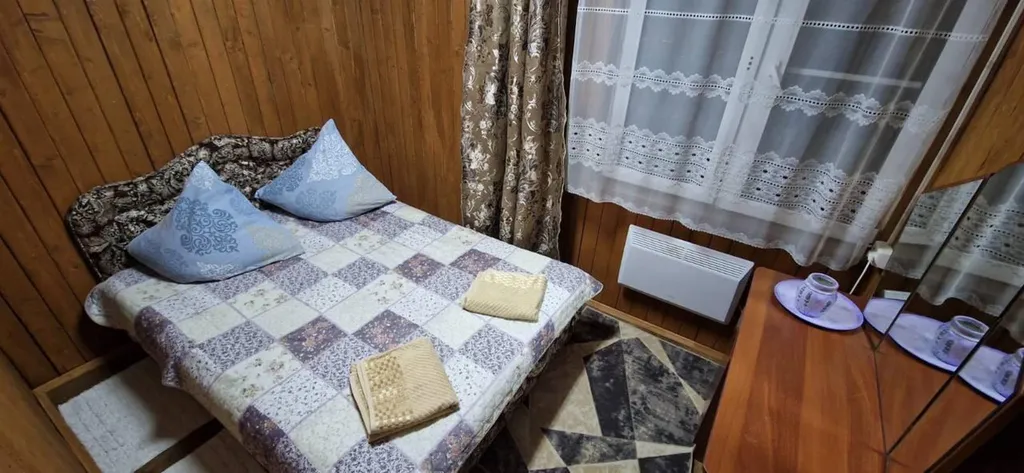 Домик рассчитан на размещение до шести человек, предлагая гостям просторную гостиную и две уютные спальни. Здесь вас ждут современные удобства: холодильник, микроволновка, чайник и вся необходимая посуда.