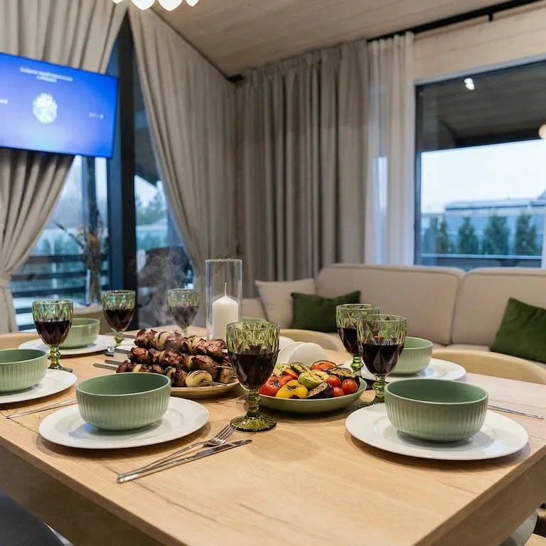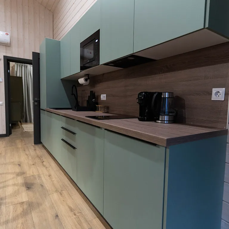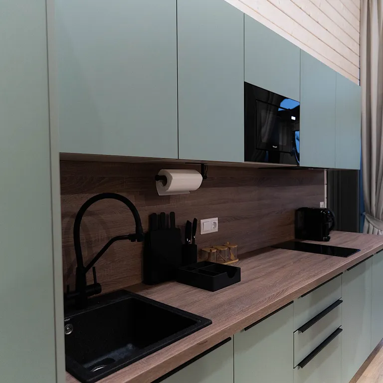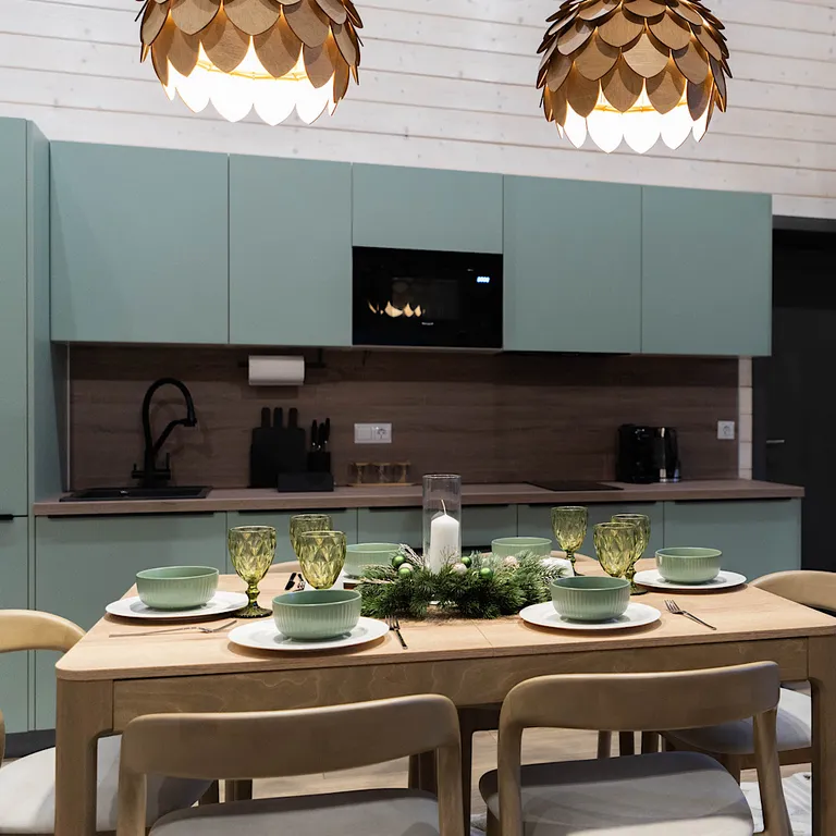 — кухня со всей необходимой техникой, посудой и столовыми принадлежностями