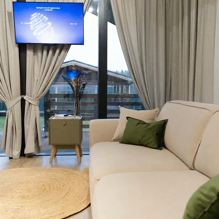 — просторная гостиная с раскладным диваном и современным smart-tv