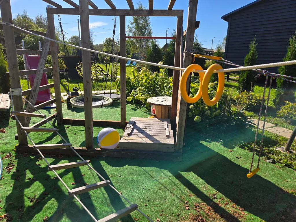 Дом с высокой террасой на запад. На территории есть садовые качели, беседка, гамак, теннисный стол, большая поляна с шезлонгами, бассейн сезонно, на поляне при желании устанавливается волейбольная сетка. Мангал со всеми аксессуарами, детская площадка. Два парковочных места.