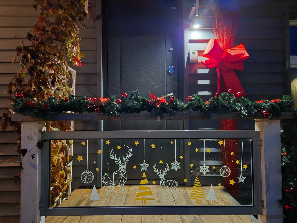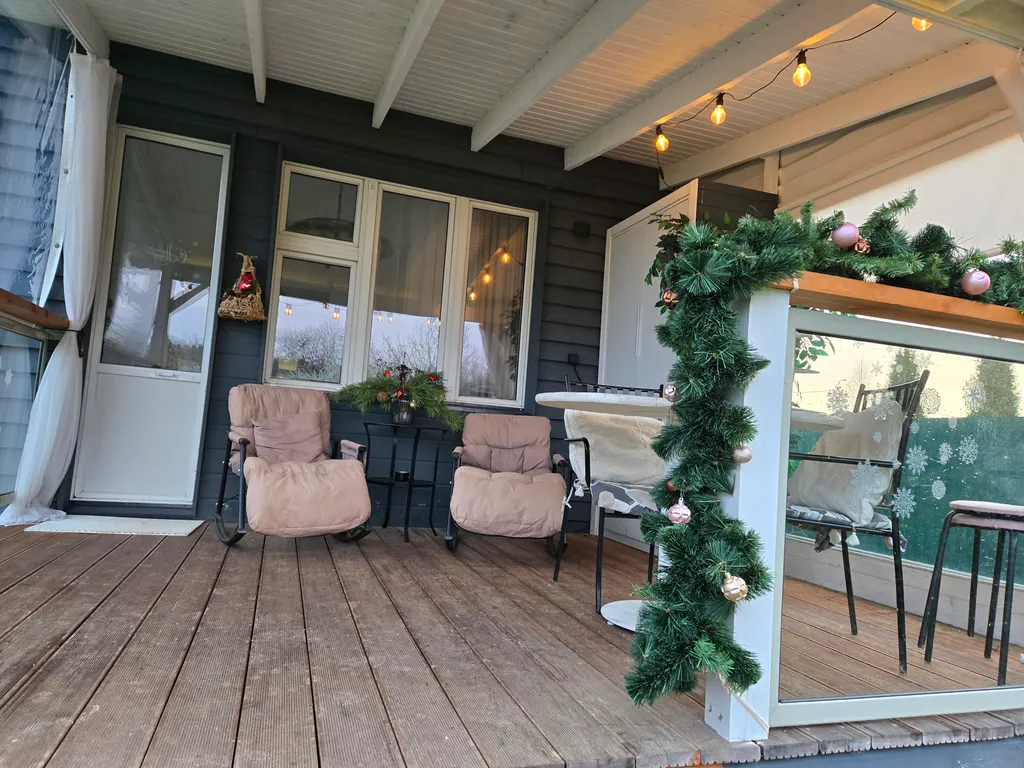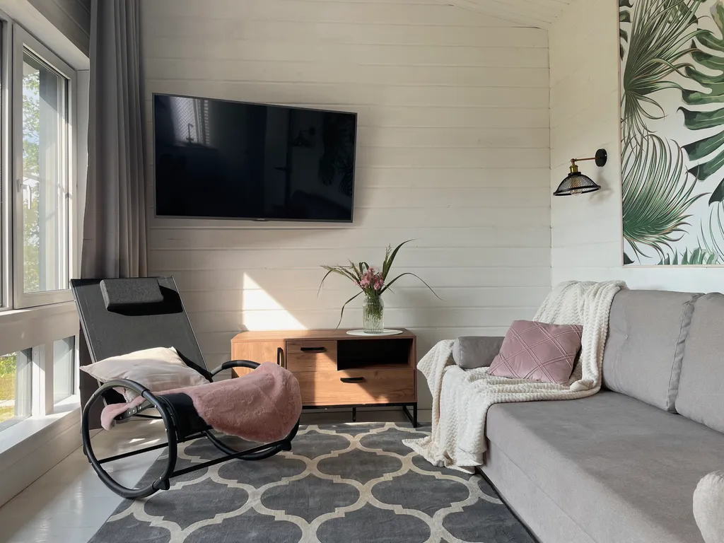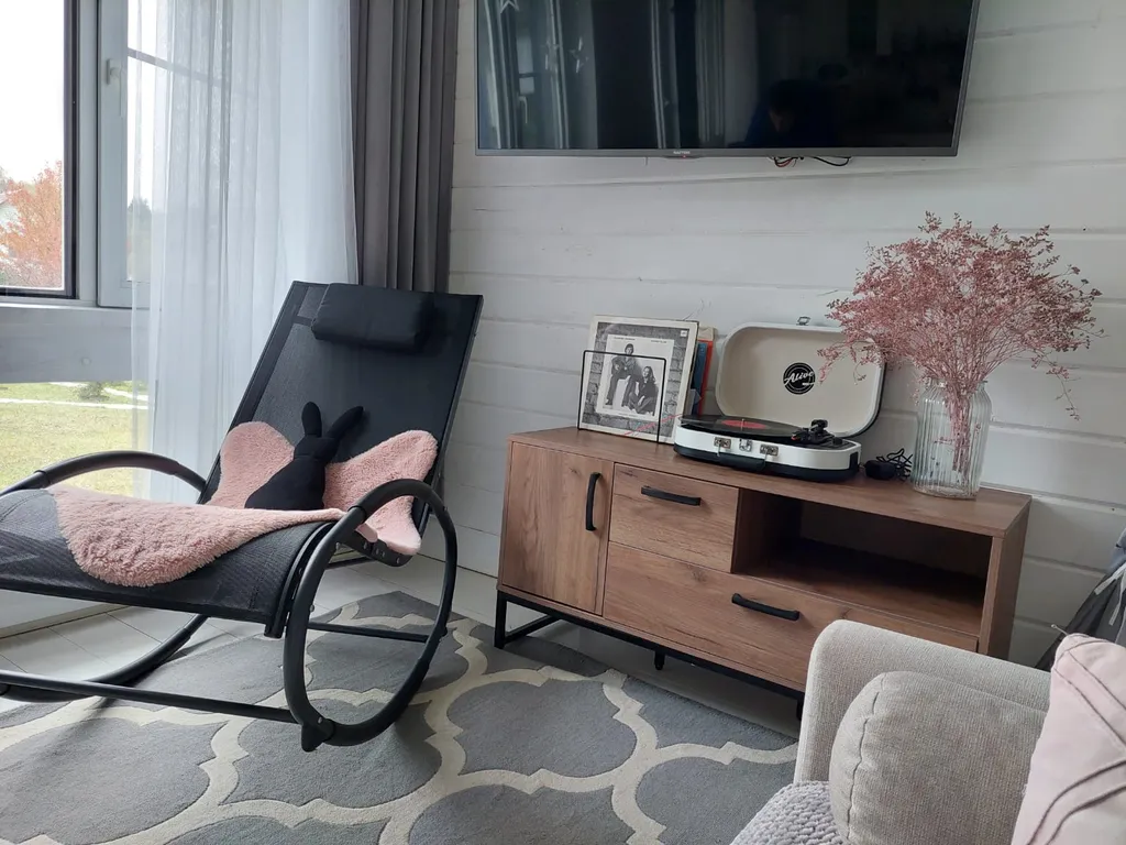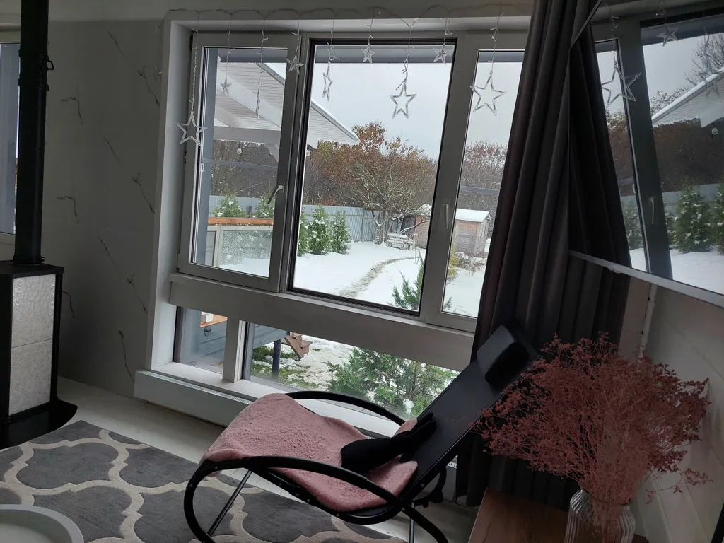 На террасе два кресла-качалки с регулируемыми спинками и сиденьями, где можно полежать, укутавшись пледами, и посмотреть на смешанный лес, закат и звездное небо.